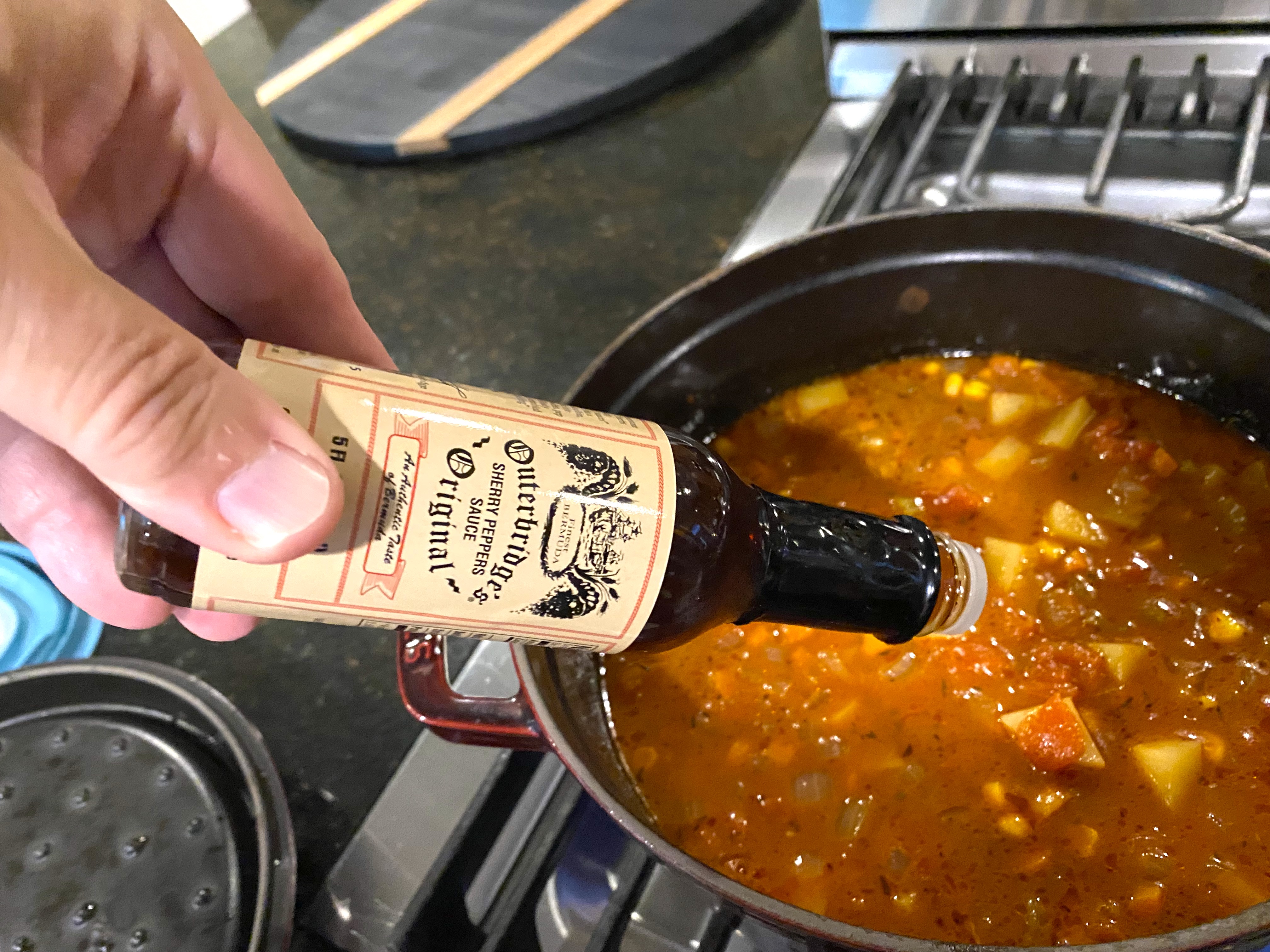 then, the fun part – add your Sherry Peppers and your rum into the mix and let it simmer for a half hour more…