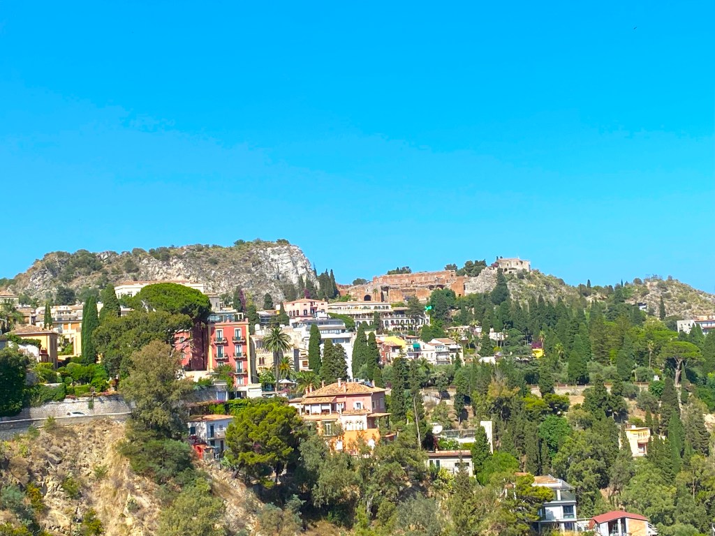 The town of Taormina is located high above the Ionian Sea on the east coast of Sicily, one of Italy’s islands!