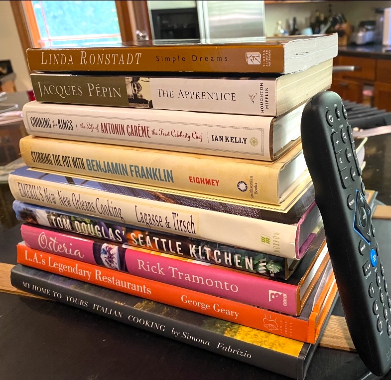 It’s week #41 in my “52 In 22” cooking challenge, and this image of my next ten cookbooks has two unique elements: one is that top book, a memoir by Linda Ronstadt – she just released a second memoir with recipes, so I will be getting that in a few weeks!