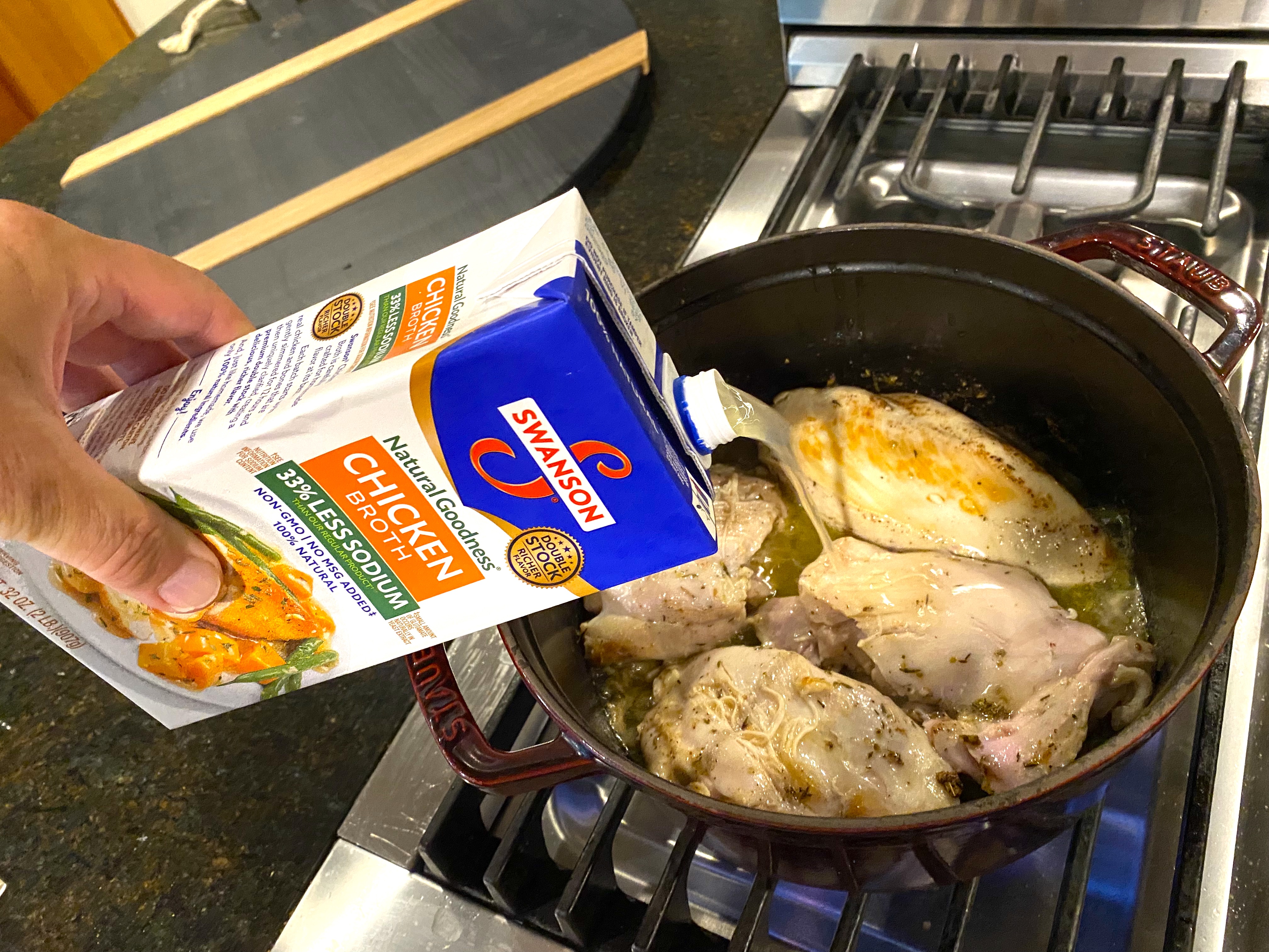 Cook until the chicken is lightly browned, about 15 minutes. Turn the pieces over and add the chicken stock.