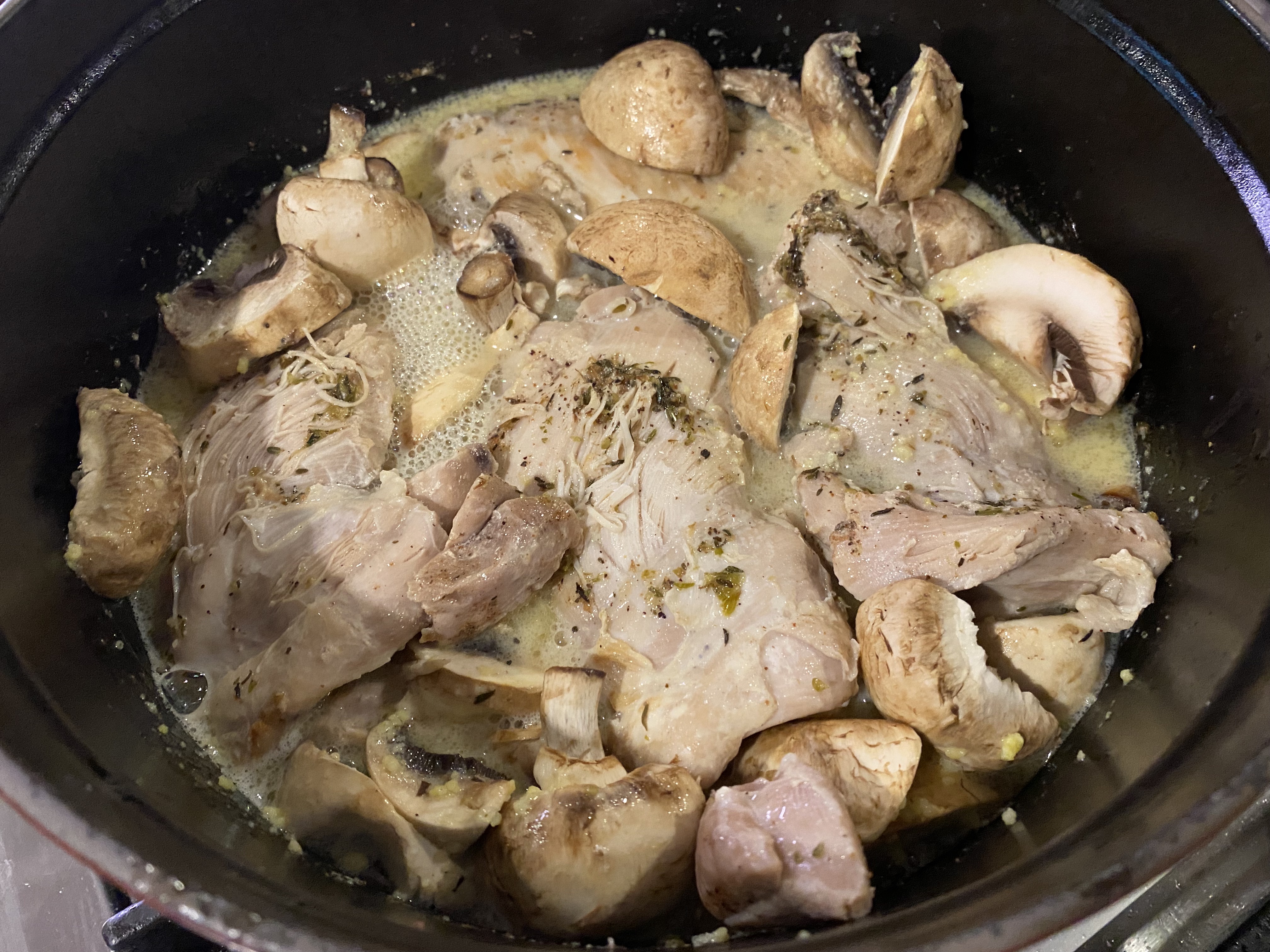 Sprinkle with the thyme, marjoram and nutmeg and cover the pan.As you can see, the chicken is literally “boyle-ing” in the butter!