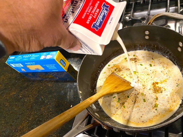 Combine the cream, green onions, garlic and creole seasoning in a large skillet over high heat. Bring to a boil, stirring, then reduce the heat and simmer for 3 minutes.