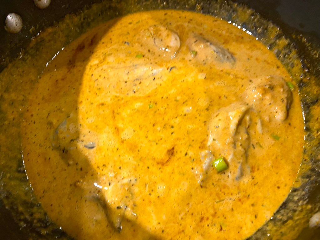 This cream sauce with the creole spices smells delicious, and the oysters plumped up nicely in the liquid in just a few minutes, and then it was time to serve it up!