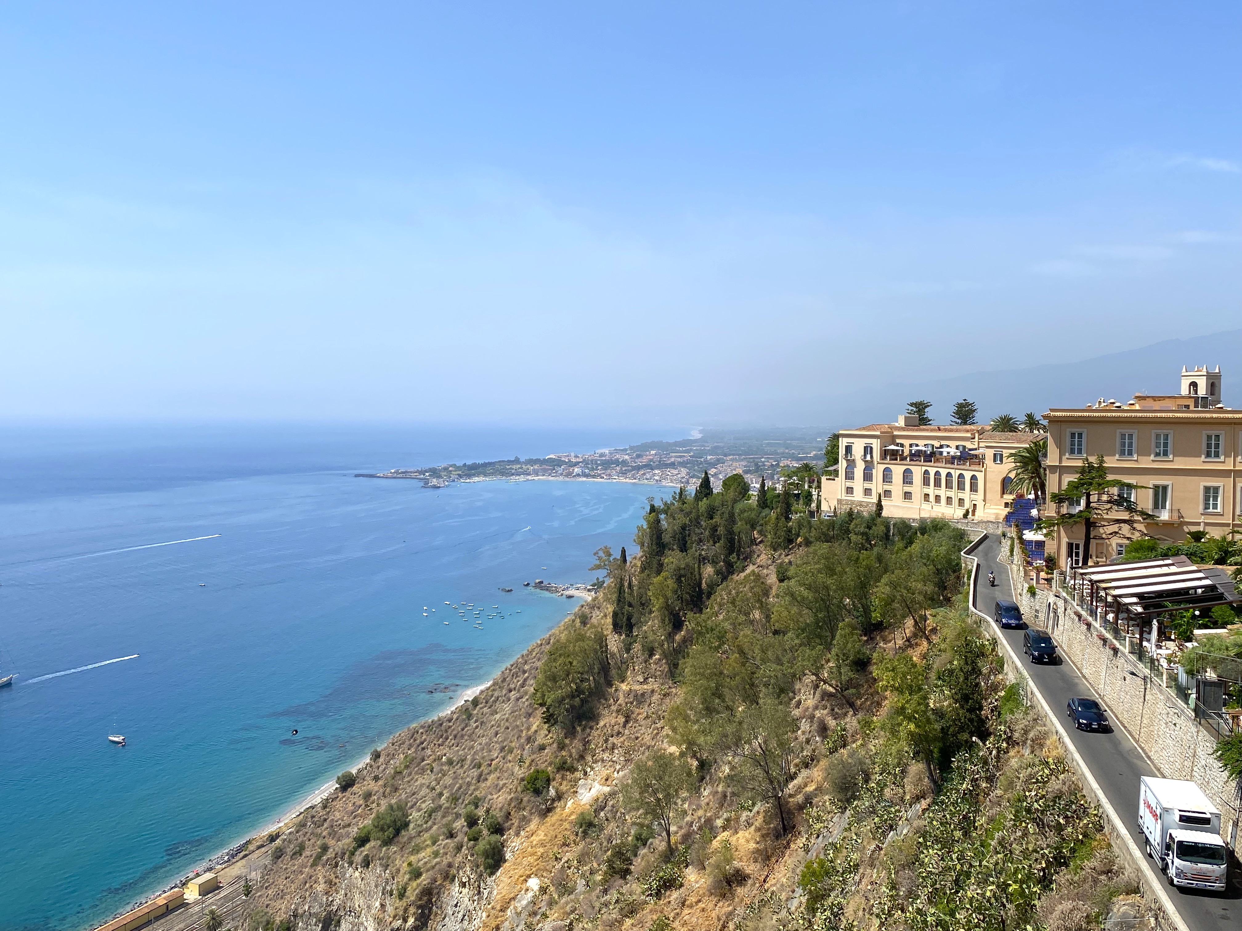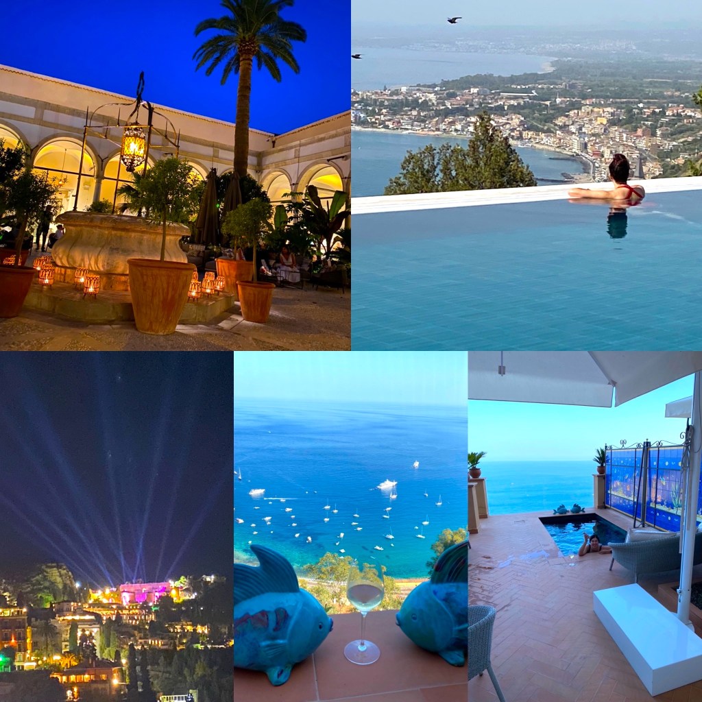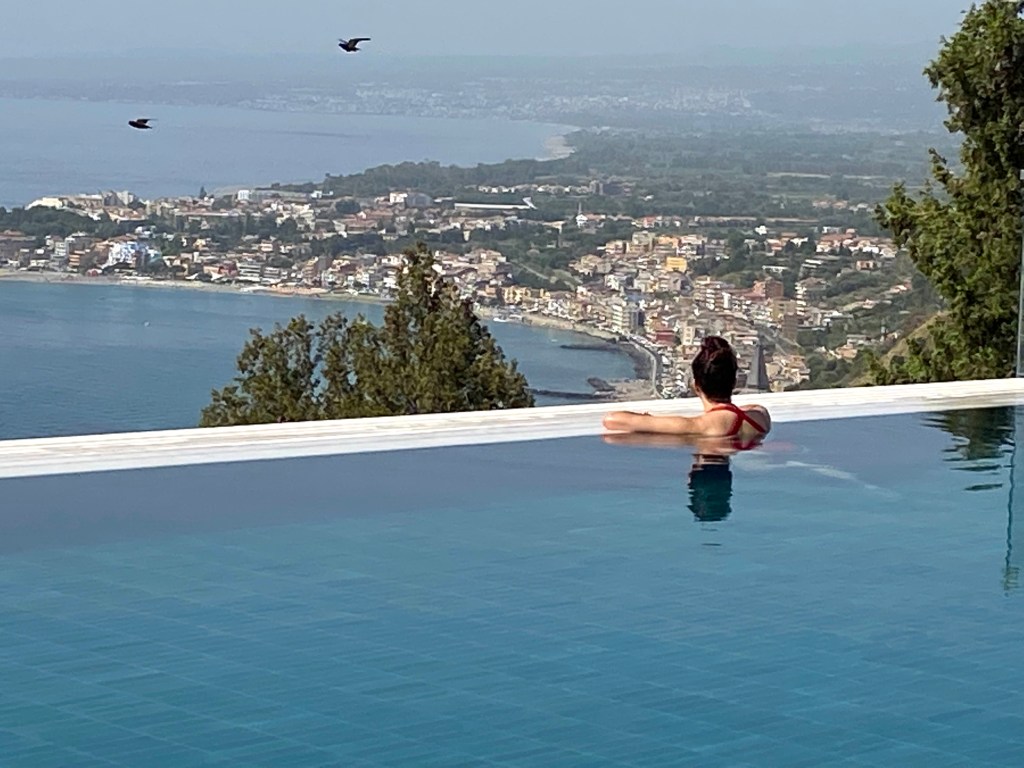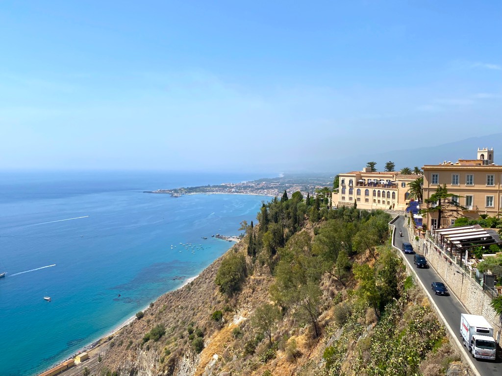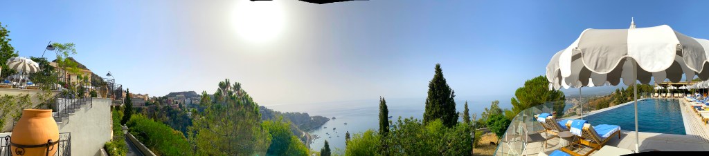 They filmed the show last winter when the hotel was off-season – this is what the hotel looks like when I was there in early July, perched on the edge of Taormina, overlooking the Ionian Sea: