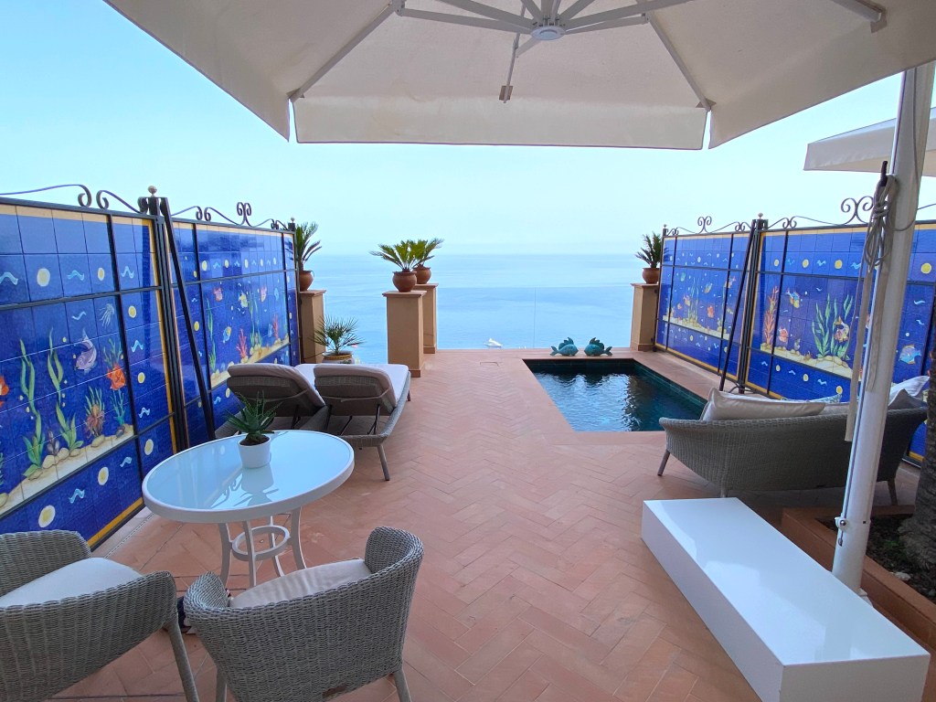 A large part of the room is outside, with a couch, two chairs, lounge chairs and a plunge pool that overlooks the coast: