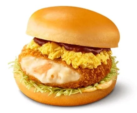 This is a burger with a deep fried croquette filled with a mixture of macaroni and white sauce that Japan calls gratin. There’s also shrimp inside the croquette, and a bit of fluffy egg on top