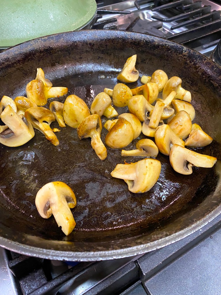 For the mushrooms, heat the butter and oil over high heat in a large skillet – add the mushrooms and toss and shake the pan for about five minutes. As soon as they have browned lightly, remove from heat. Set the mushrooms aside until needed.