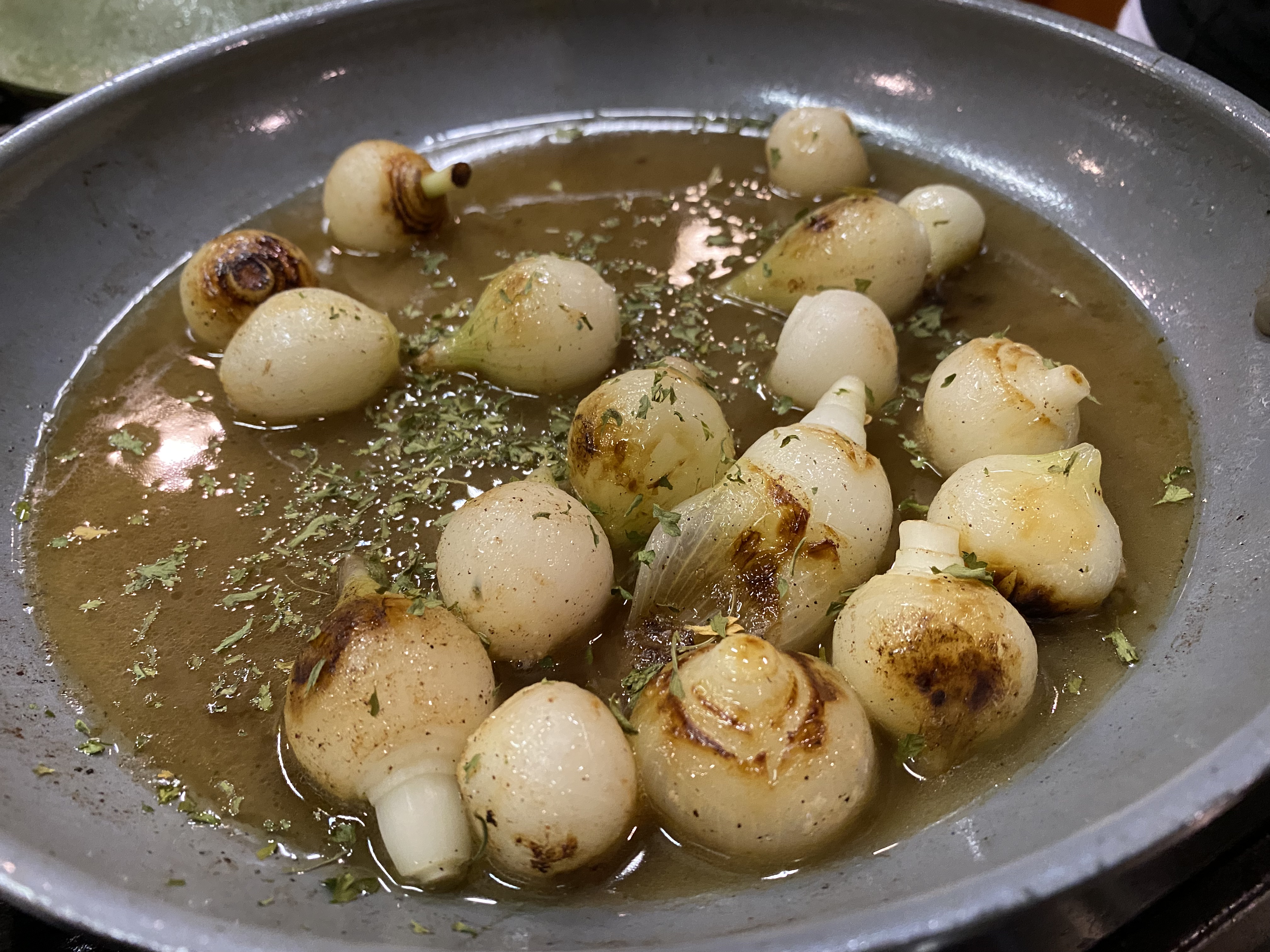 Eleanor puts it in the oven and it’s time to re-fill our wine and get to the next part of the recipe, beginning with the pearl onions, which Eleanor boiled them in water for just a couple of minutes and let them cool – and here’s how easy they are to skin!