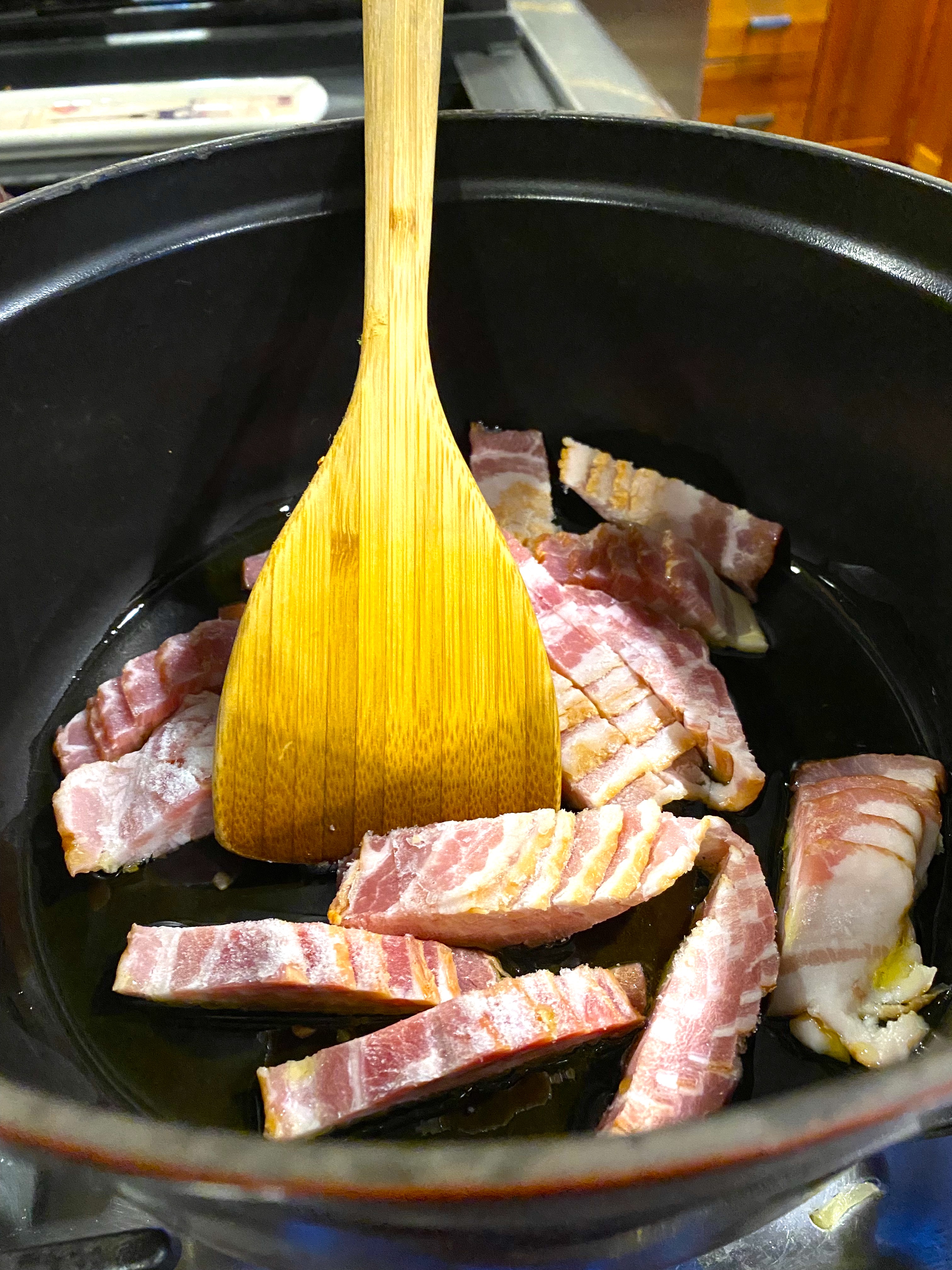 Cut the bacon into lardoons (sticks, ¼-inch thick and 1 1/2-inches long).