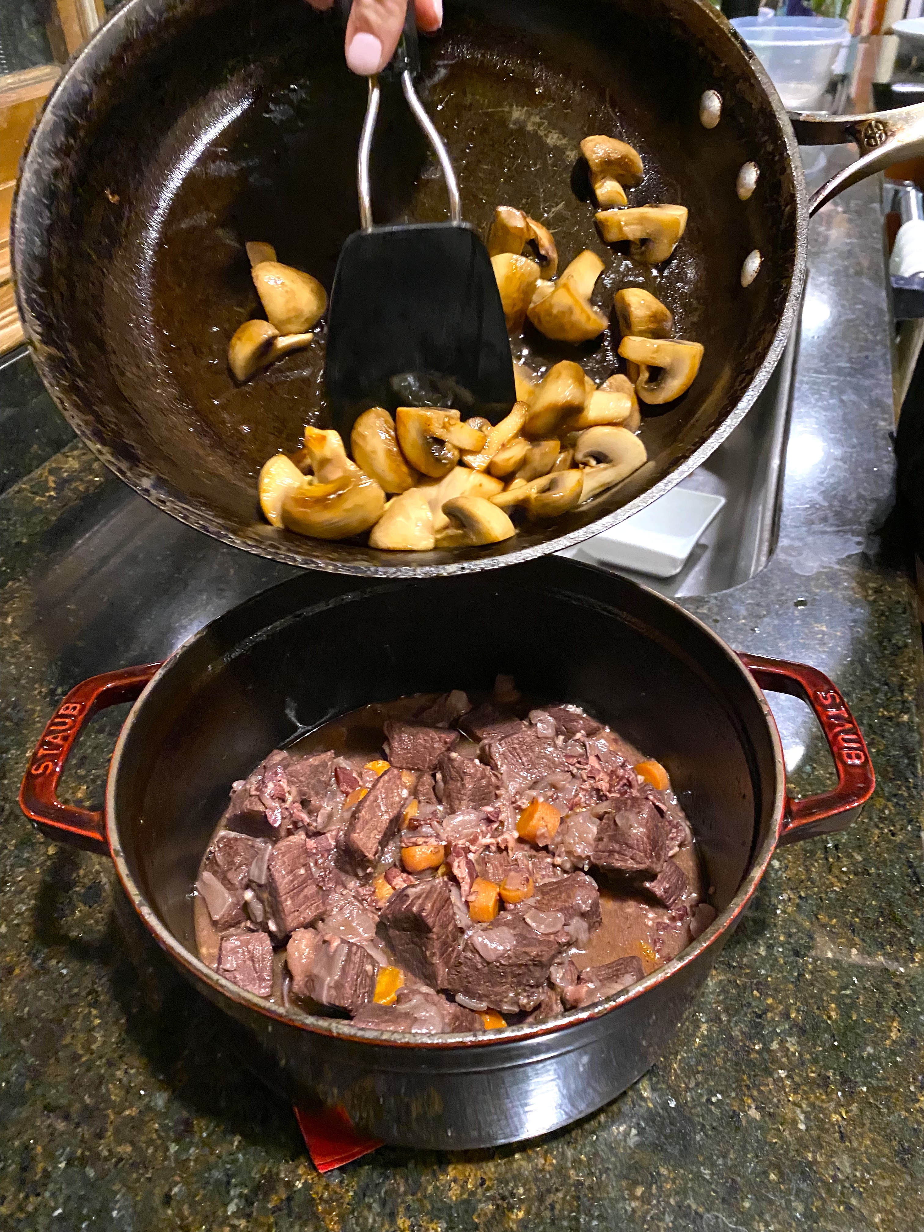 Return the beef and bacon to the casserole dish. Next, slide the cooked onions and mushrooms over the meat as well.