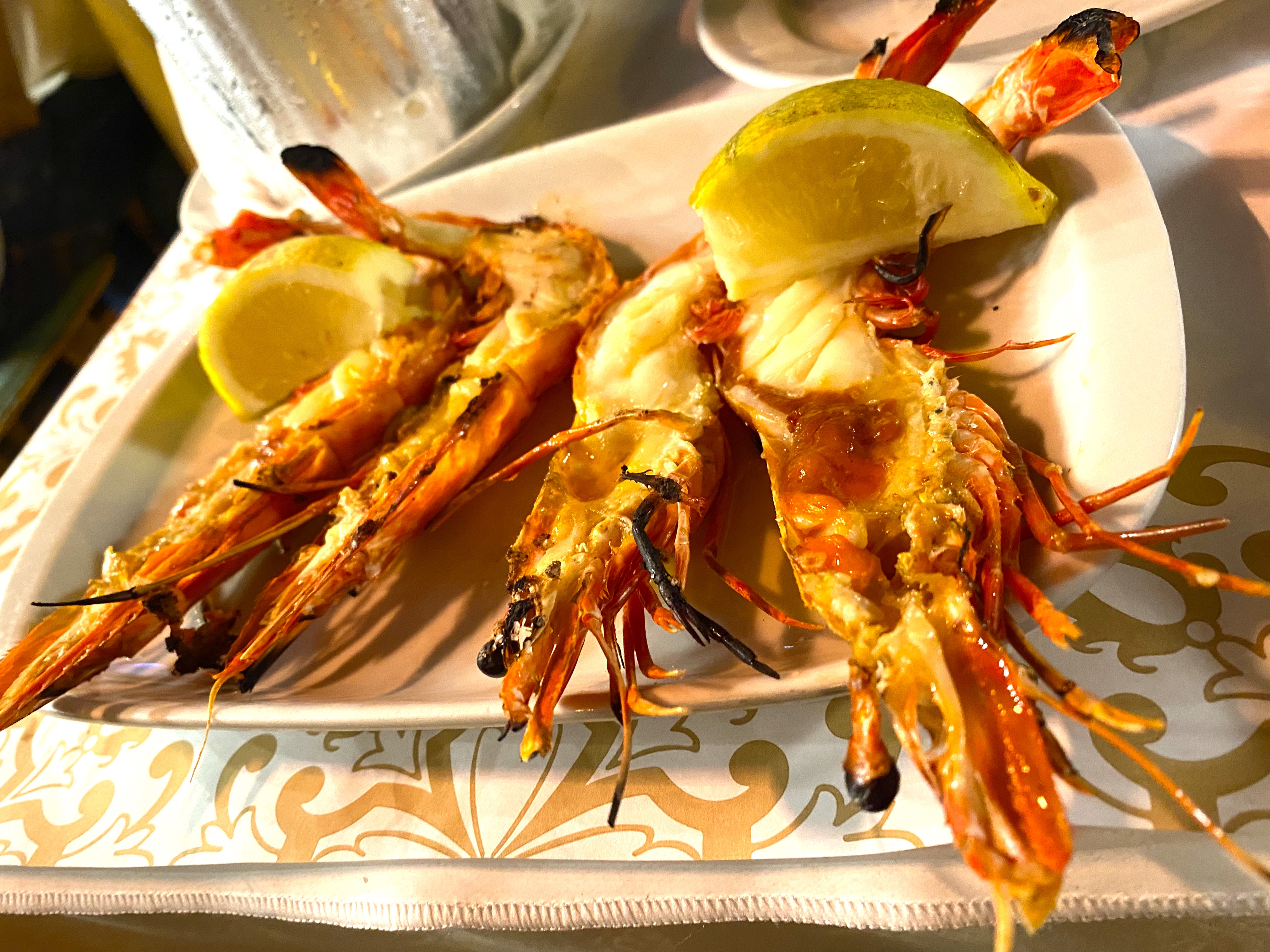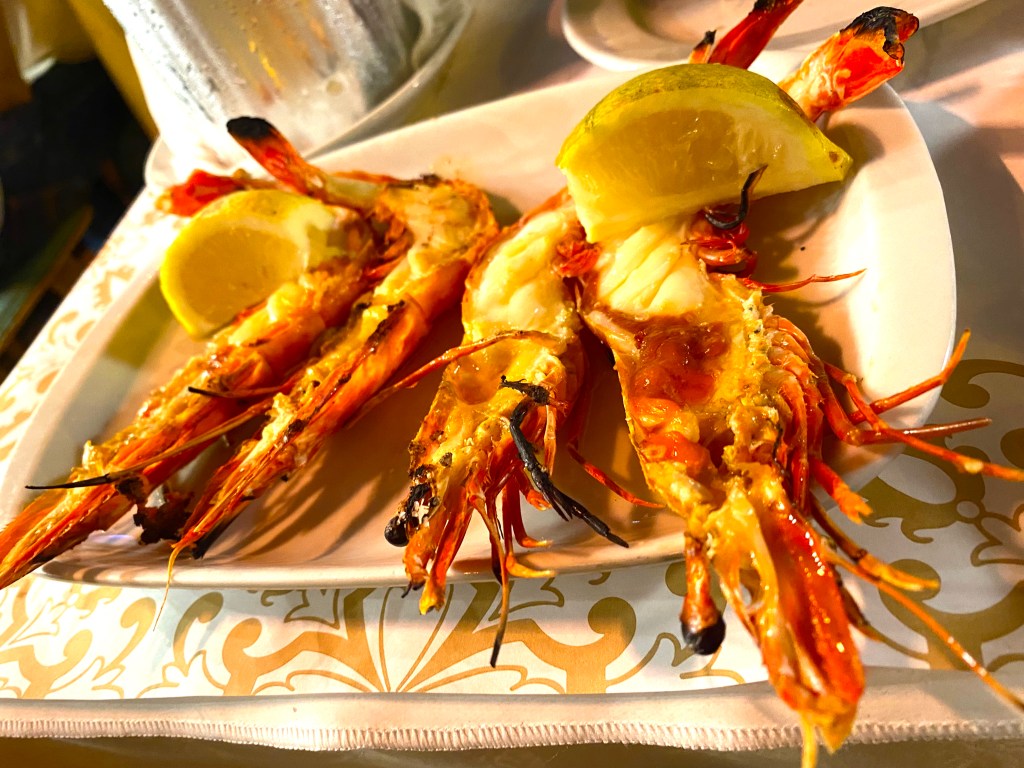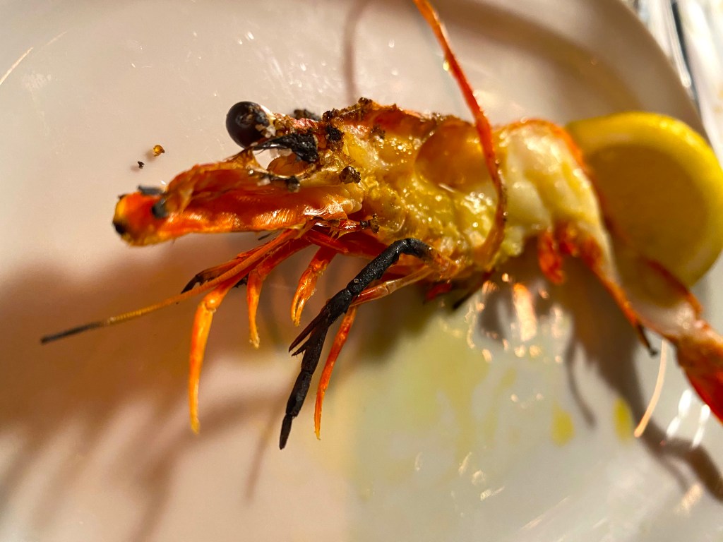 Next up: more local Shrimp, split and grilled – with a wedge lemon to use as well…deliciously fresh and yes, I caught one of them eyeing me as I ate:
