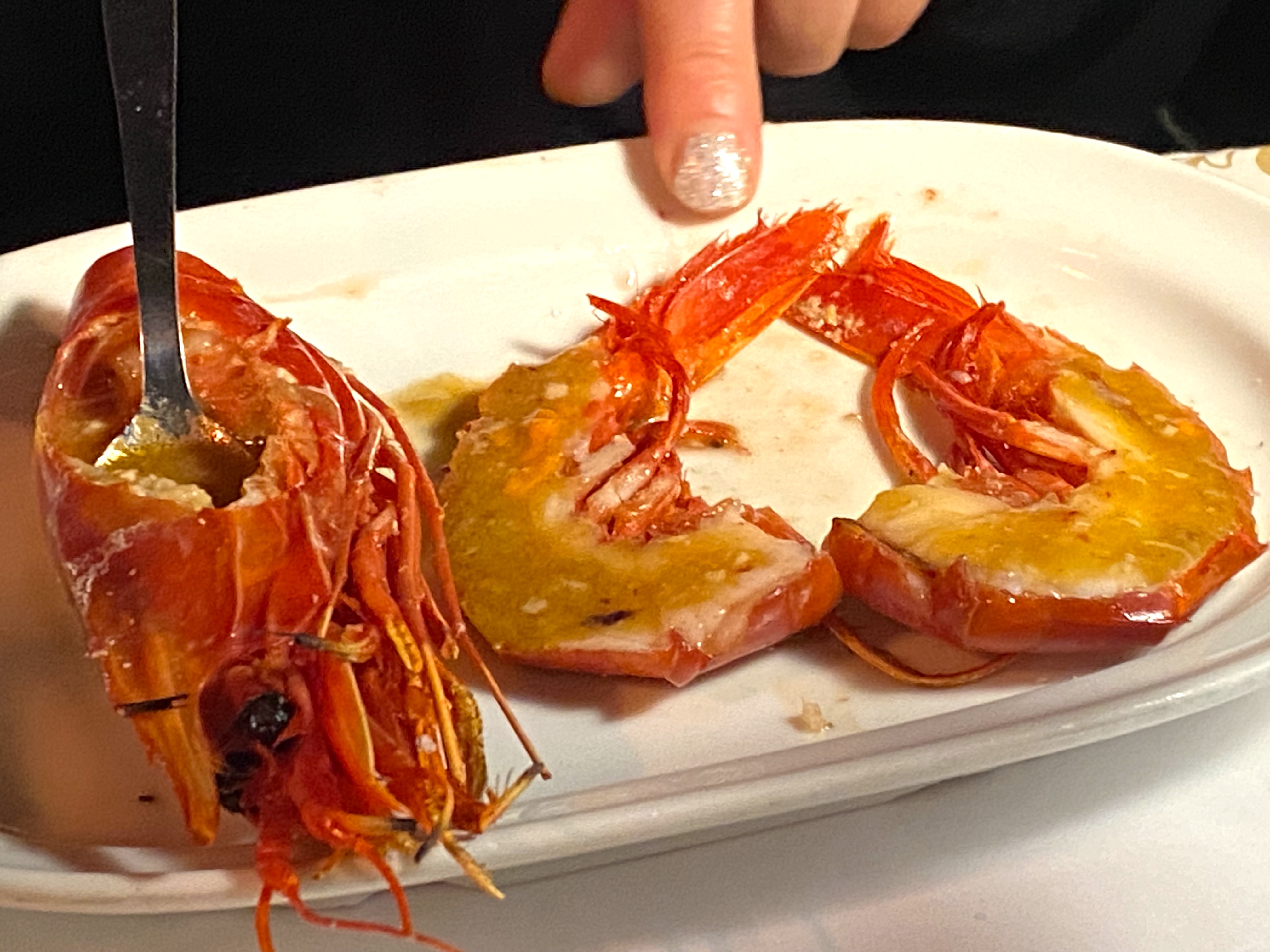 We laughed but he was serious – so we ignored them until, with great flourish, our Waiter returned and the carving of the “Scarlett Shrimp” began: