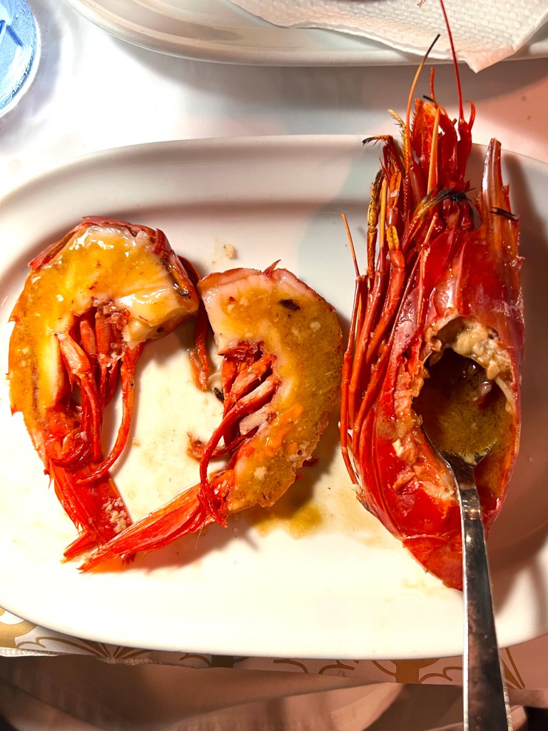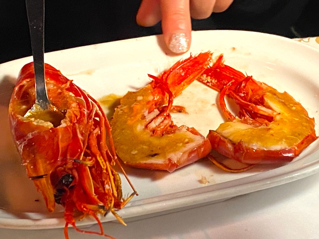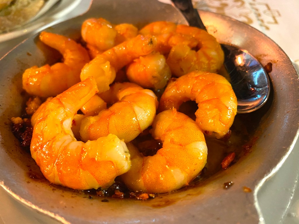 It began with these shrimp, which arrived sizzling in garlic and olive oil…just what we wanted to hear….listen: