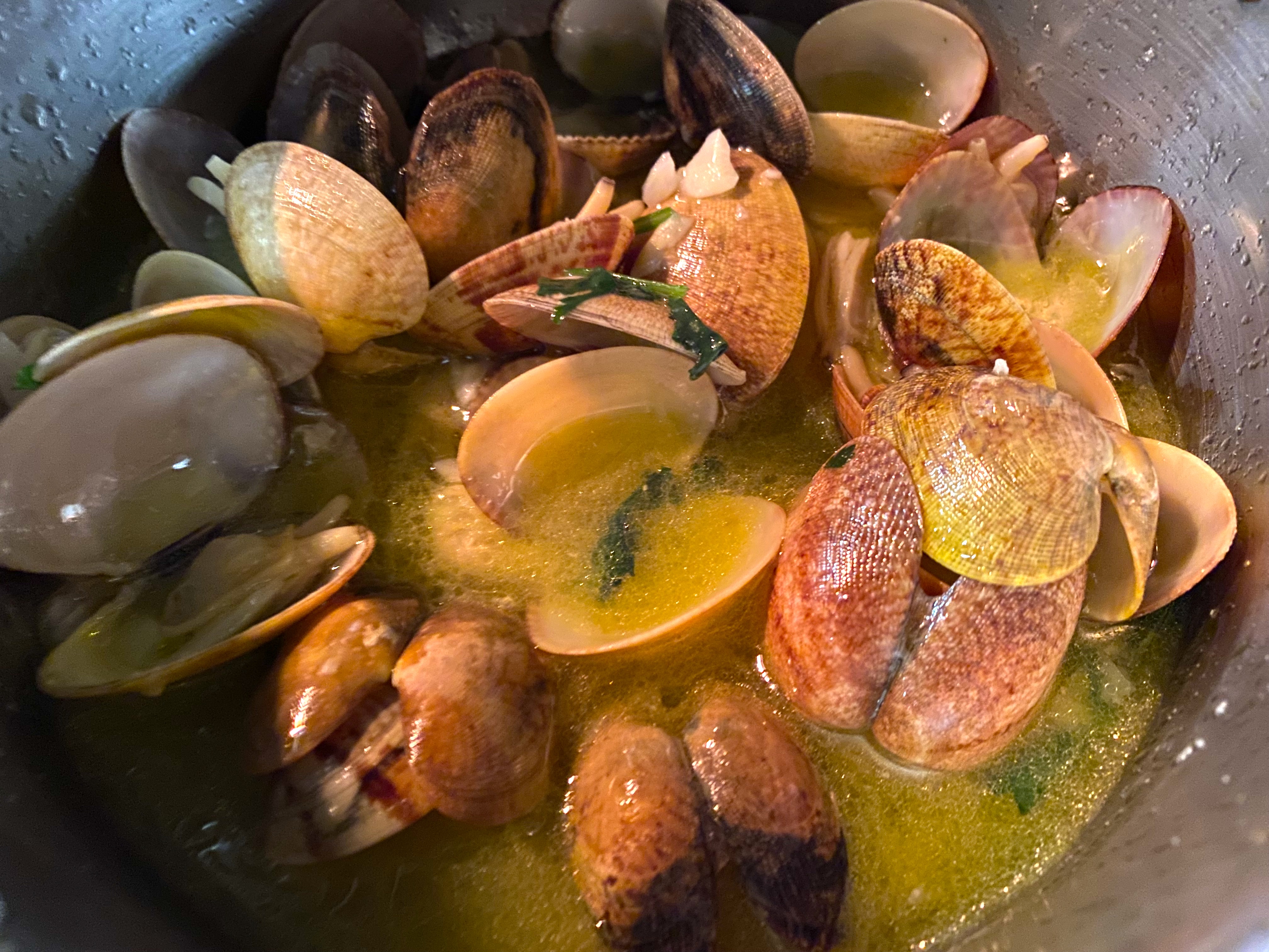 The bread got some use again as a bowl of clams steamed in garlic and fish broth arrived – the clams were dredged with the bread and were so so good: