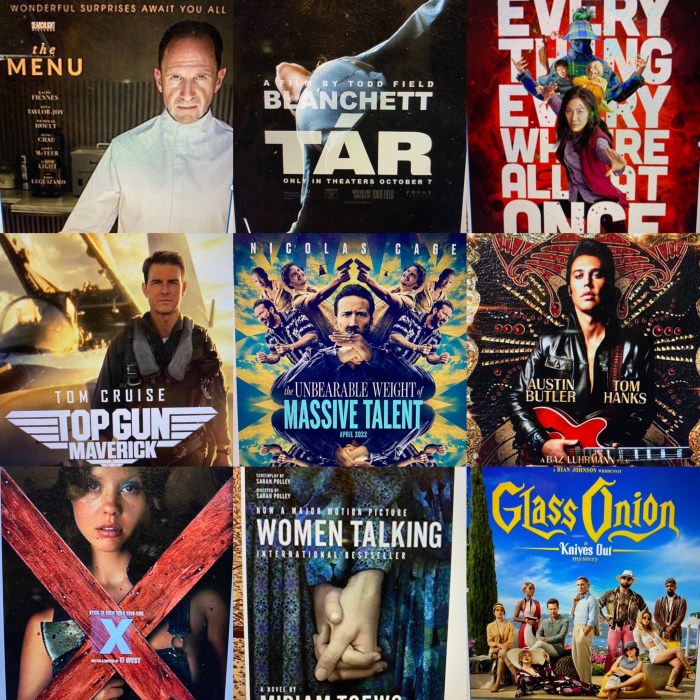 5. You and I could not be more off on parts of this list. I thought “Babylon” was the WORST movie of the year. I also gave “Everything, Everywhere All at Once” two tries and couldn’t make it through. “Tár” got much better after the first, excruciating 15 minutes. “Elvis,” “The Menu,” and “The Unbearable Weight Of Massive Talent” were all so-so for me.