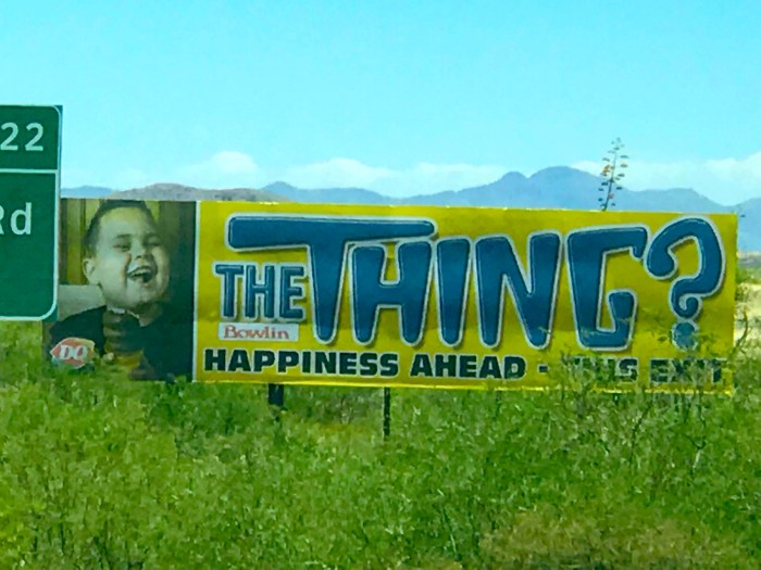 “The Thing” is an Arizona roadside attraction hyped by signs along Interstate 10 between El Paso, Texas, and Tucson, Arizona. A large number of billboards entice travelers along this sparse stretch of desert highway to stop, just to find out what the mysterious Thing might be. The object, supposedly a mummified mother and child, is believed to have been made by exhibit creator Homer Tate for sideshows.
