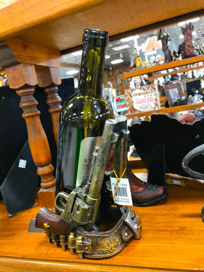 Once inside, we found ourselves in a gift shop that had a lot of unusual things for sale, like this wine bottle holder fashioned out of two six-shooters: