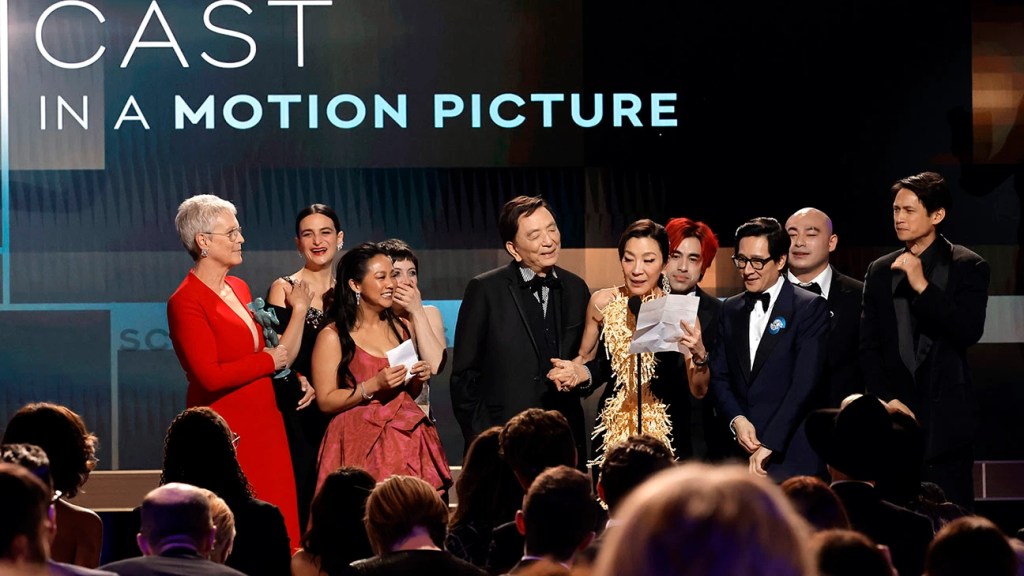 “With less than two weeks to go before the Oscars ceremony, the A24 multiverse comedy made a huge demonstration of strength over the weekend, first winning the top honor at Saturday’s Producers Guild Awards, then sweeping Sunday’s Screen Actors Guild Awards. Each of these individually would be a plumb prize for any awards hopeful: PGA because it uses the same preferential ballot the Oscars do; SAG because it represents actors, the Academy’s largest branch. Throw in the Daniels’ trophy for feature directing at last weekend’s Directors Guild of America Awards and EEAAO has taken home the triple crown of industry precursors. That’s a haul only the heaviest of Oscars hitters obtain — in the era of the preferential ballot, just Birdman, Argo, and The King’s Speech have done it. It’s the kind of thing that makes you ask not whether a film can win Best Picture but how many other trophies it’ll nab along the way.”