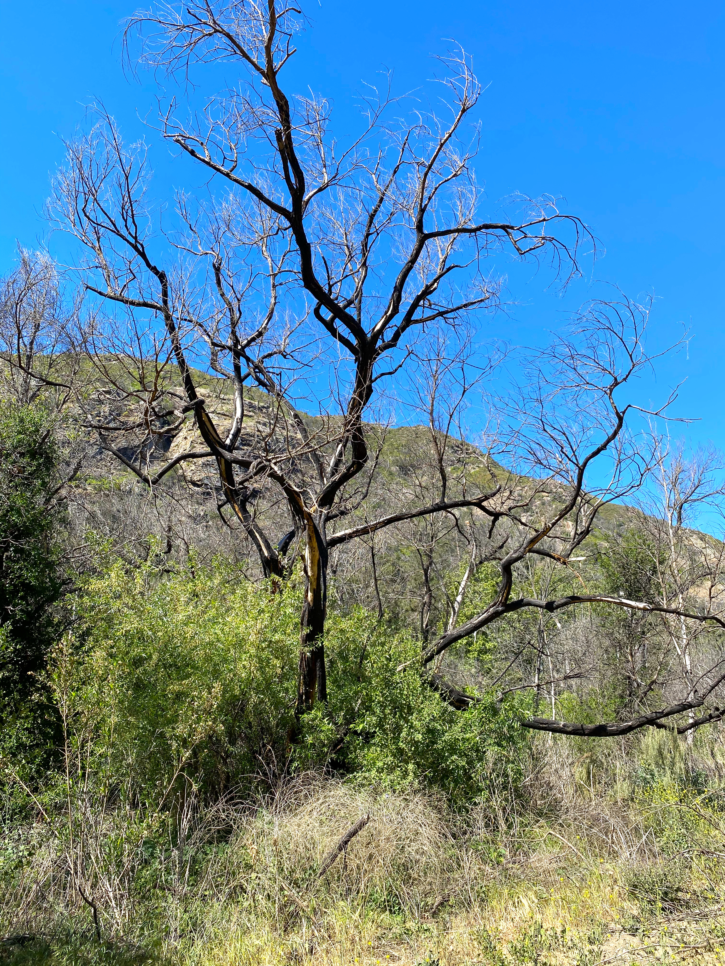 After a half mile, you round a bend are are greeted by a pretty steep climb that goes on for about a half mile – and no shade…and along the way you see some of the impact of last year’s devastating wild fires in the area:
