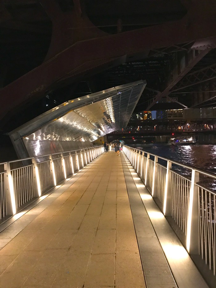 The two miles of walkway are on the south side of the river on the left, as you can see in the shot above, taken from the Lakeshore Drive bridge – and this is what the bridge looks like from the north side of the river: