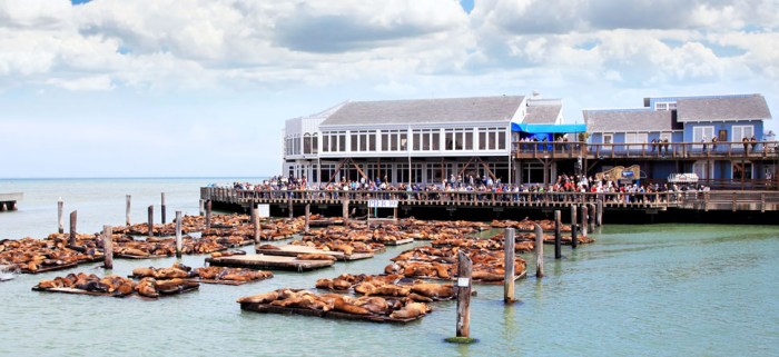 This is Pier 39, located along San Francisco’s iconic Fisherman’s Wharf district – and it is also a gathering spot for hundreds of wild Sea Lions!