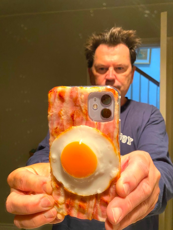 OK, ignore the hair – this is a selfie from pandemic times of my bacon-and-egg iPhone cover – it tends to get noticed and that night in Bordeaux was no different……because I was filming our Server bringing my flaming sauce for the Pigeon to my table when he spotted my phone!