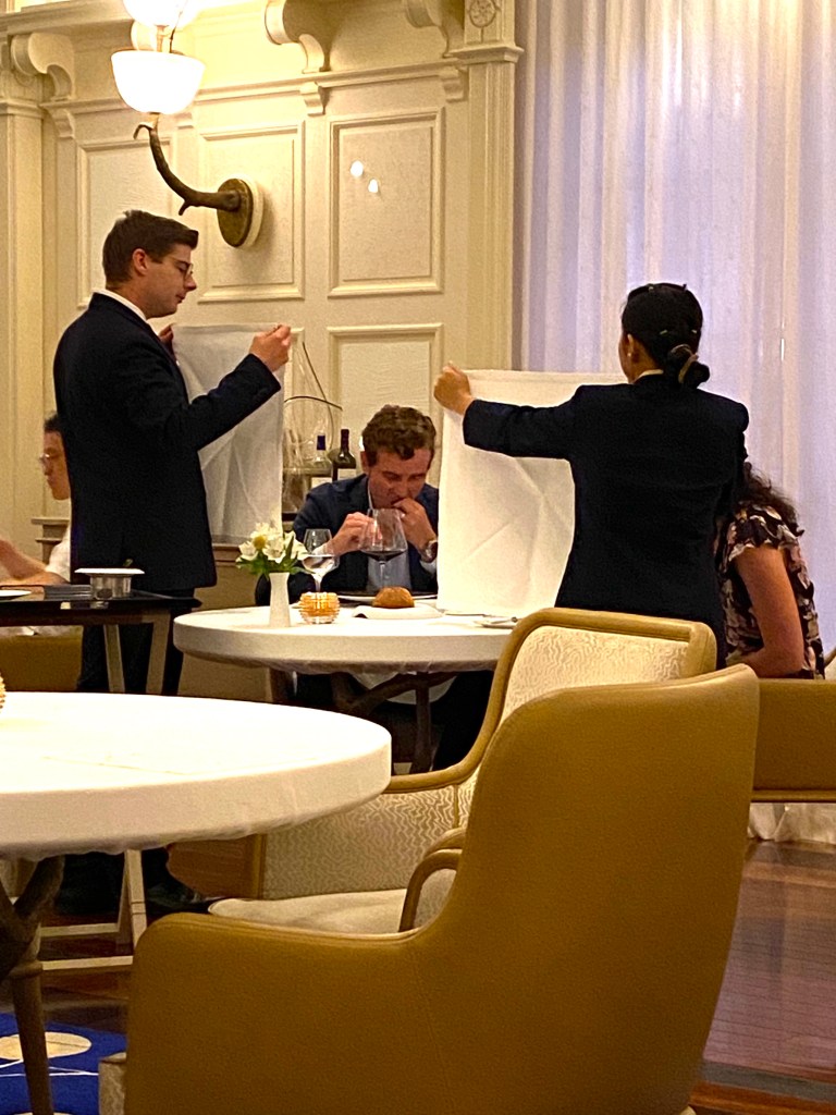 Fans of “Succession” saw this happen hilariously in the show – but while we weren’t draped completely with the napkin, we were shielded as you saw – and I wasn’t alone!