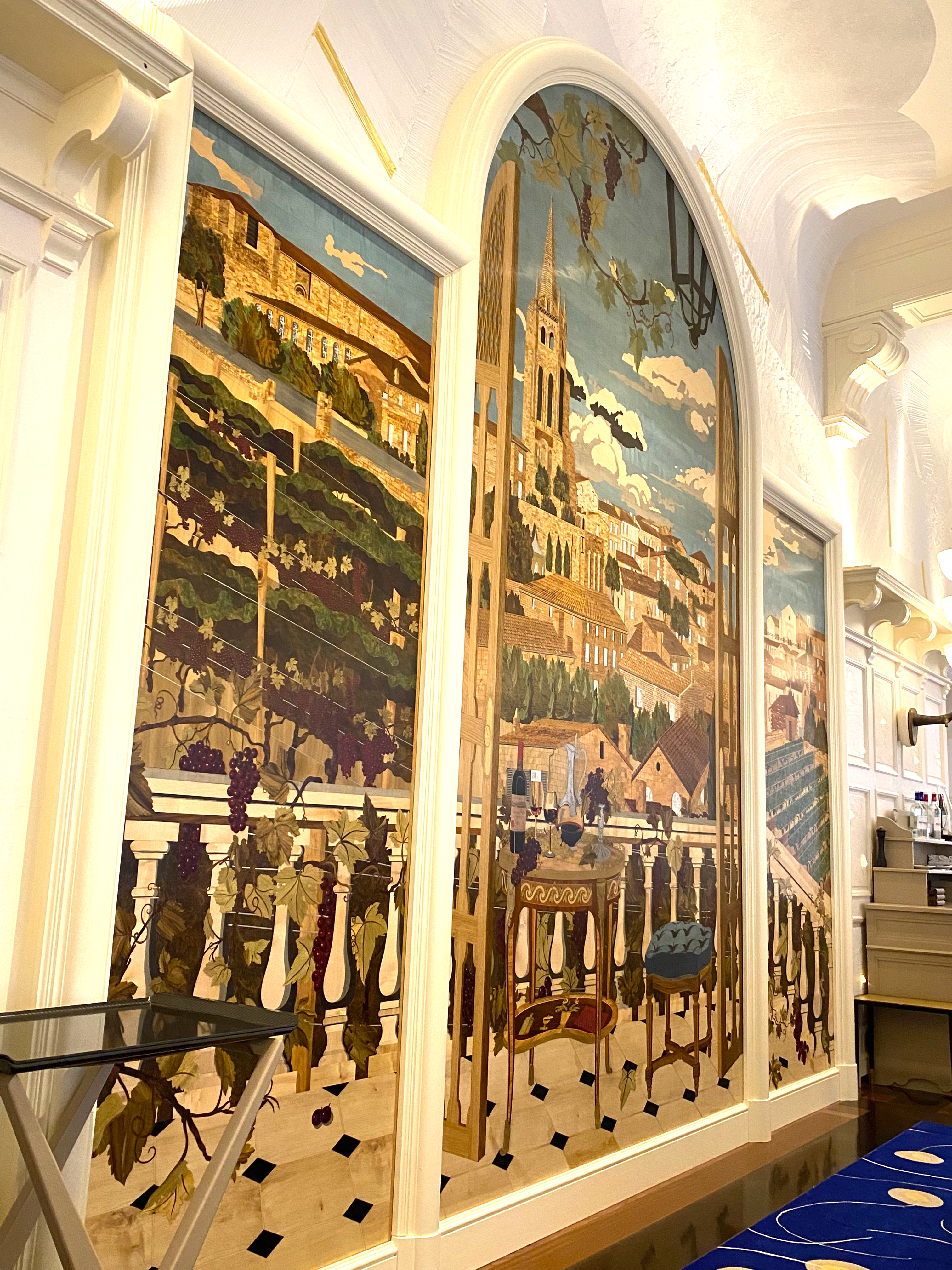 We were greeted warmly by the team, who told us the Ortolan-inspired Pigeon dish was unique, so we said sure – although we were unsure of what was ahead of us – except to be wowed by the artwork of the town on the wall to our left: