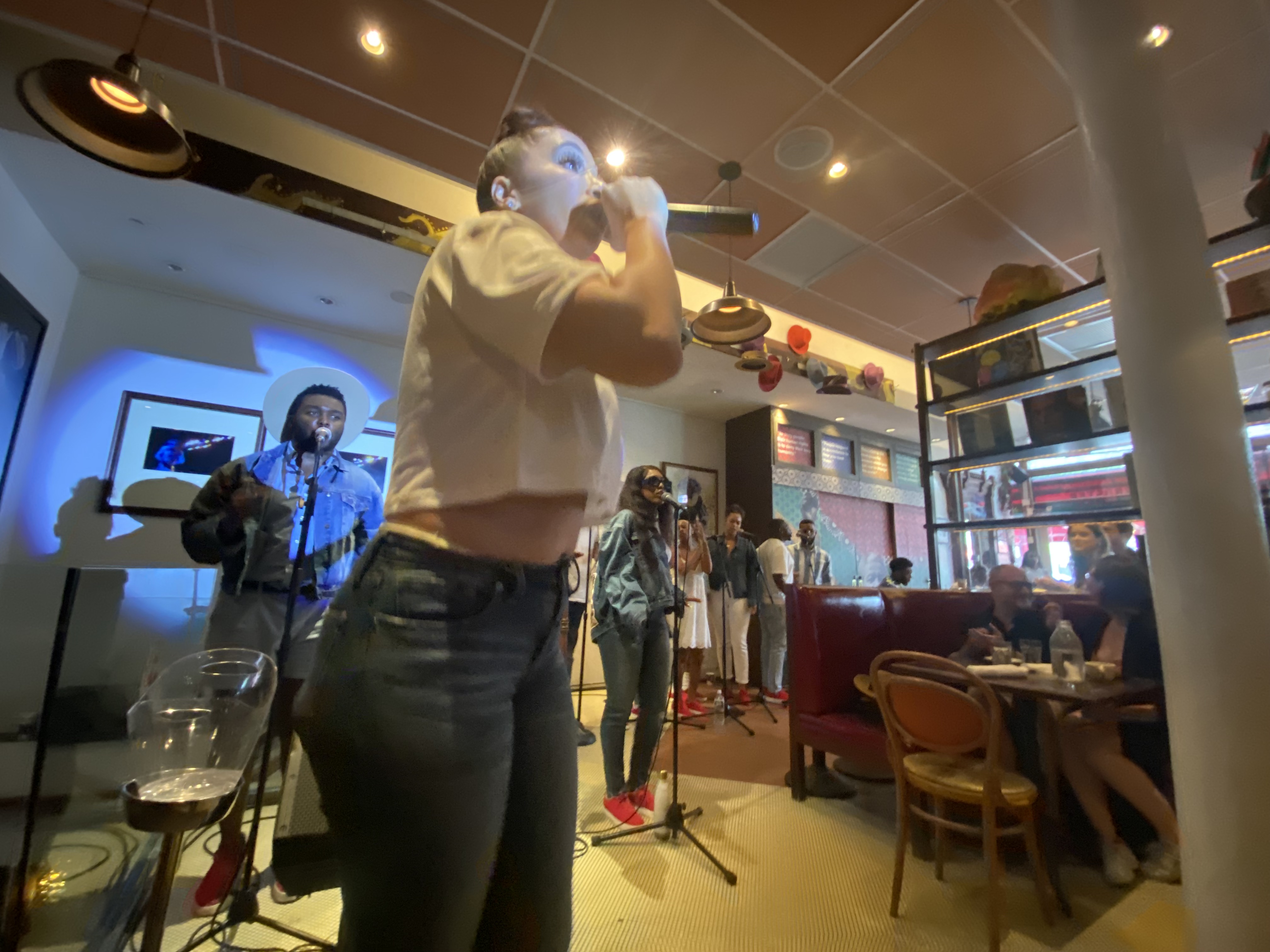 This is a picture of the group “Sing Harlem” as they rock out a absolutely terrific gospel brunch – sporting their signature red tennis shoes!