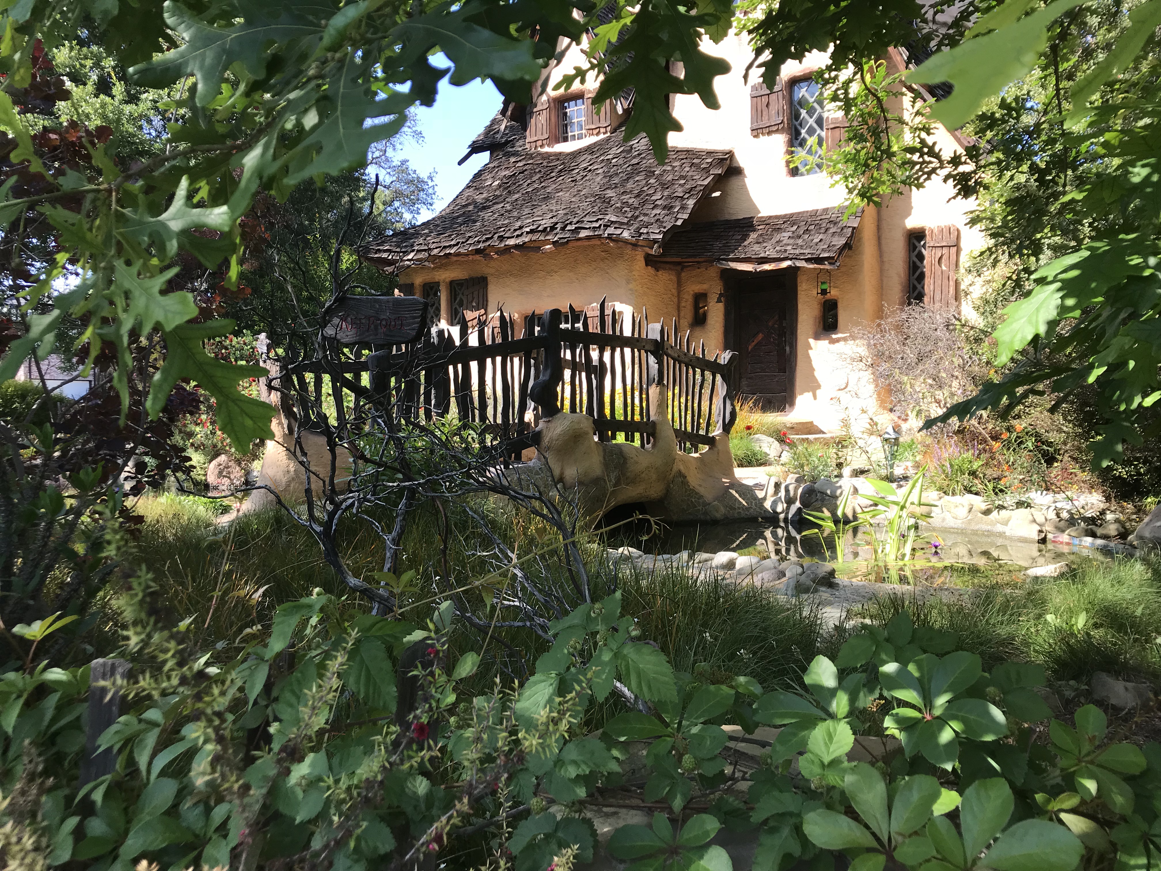 “The house was designed by Hollywood art director Harry Oliver, who went on to play a major role in Storybook architecture. Oliver was a Hollywood art director who worked on more than 30 films between 1919 and 1938 as art director, art department & as set decorator. It was originally built in 1921 to serve as the offices and dressing rooms for Irvin Willat’s film studio in Culver City, and was moved to its present location in 1934. The converted private home, with its pointy, lopsided roof, tiny windows and stucco with a distressed paint job were then surrounded by an intentionally overgrown English-style garden and a moat-like pond.”