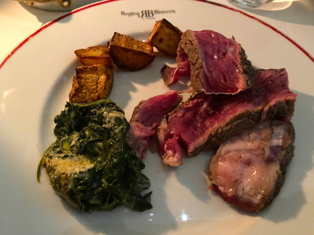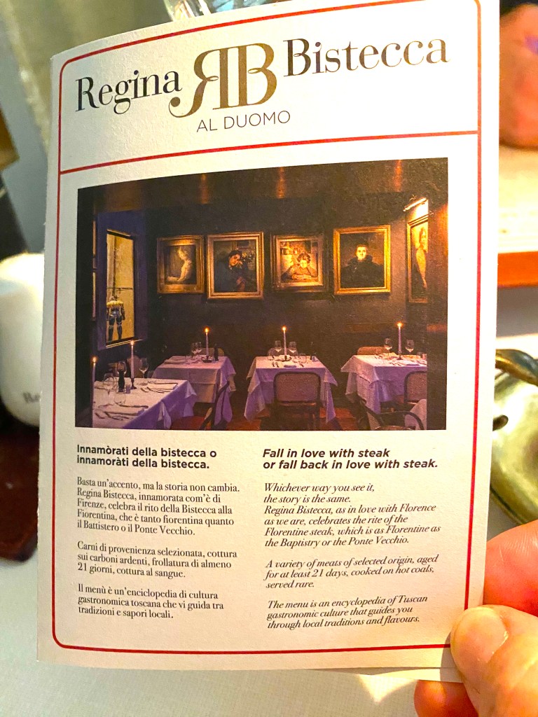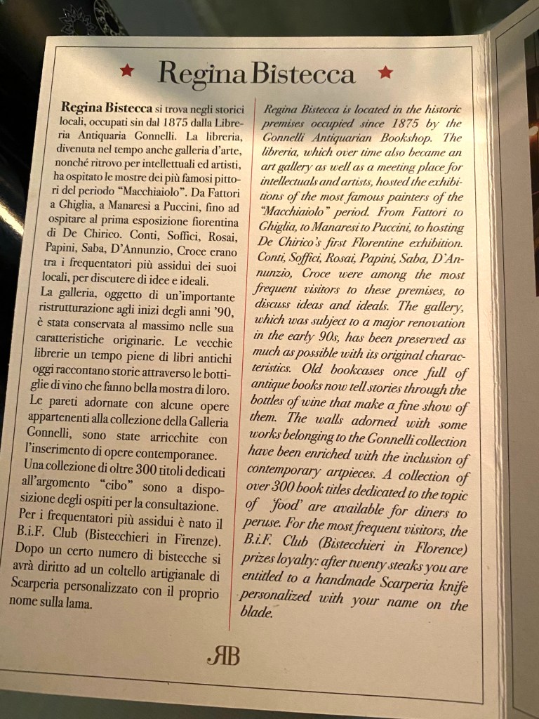 We planned far enough ahead to be able to get a reservation at Regina Bistecca – the most famous steakhouse in Florence – you know, the one with one table in a library setting?