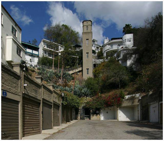 Alison adds: “It was apparently the inspiration for Raymond Chandler’s book, “The High Window” in which Chandler describes the residence of Philip Marlowe as being on the cliffs above High Tower Drive in a building with a fancy elevator tower.”