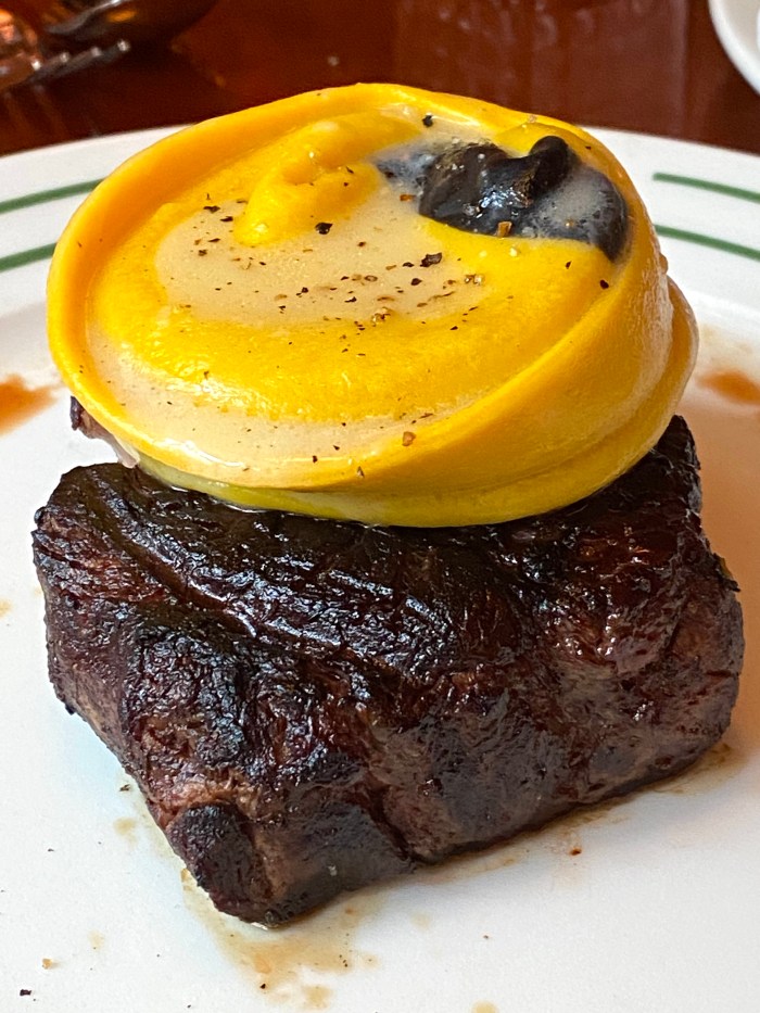 Yes, what a dish! You can order the filet with special sauces as well as additional toppings – like this raviolio!