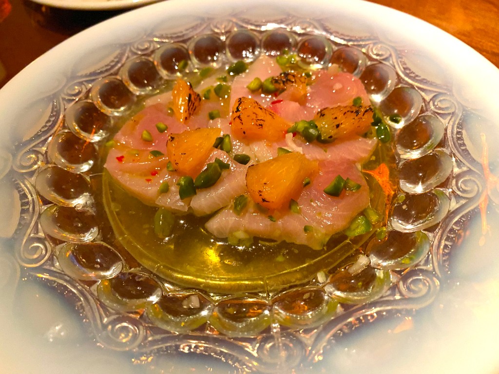 This Yellowtail crudo with charred grapefruit and pistachios is a great “one bite” and pass it on dish – delicious, but better to save your appetite for the next dish:
