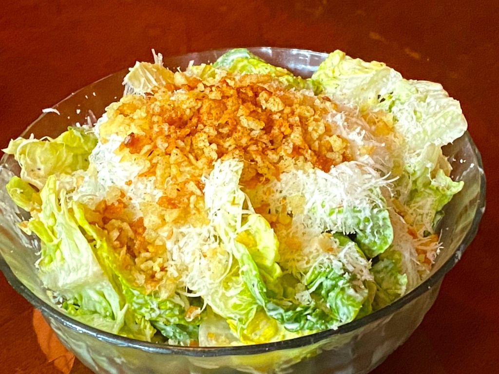 This is a delicious take on a classic Caesar salad, with ciabatta bread crumbs on top of little gem leaves and a deliciously spicy caesar dressing!