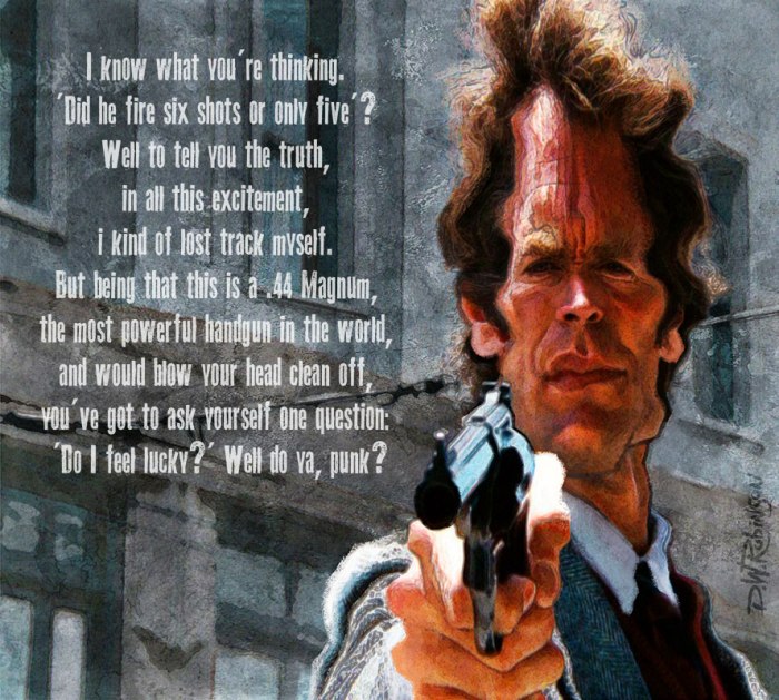 Clint Eastwood starred as “Dirty Harry” Callahan, who was given every crummy job the SF police department didn’t want to handle. Early on in the film, Harry confrtons a bank robber with some questions that became iconic: