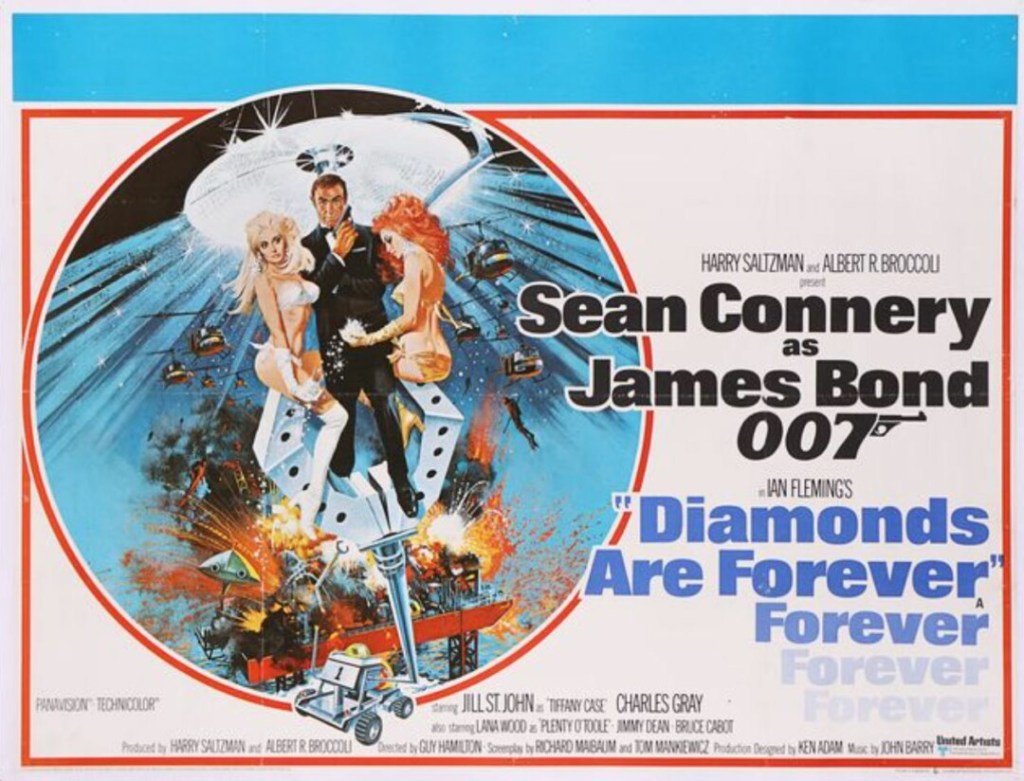 This was the 7th James Bond film, released in 1971 – by now, theme songs had been done for the series by Tom Jones, Nancy Sinatra and Shirley Bassey, who returned from her legendary “Goldfinger” theme song for this one: