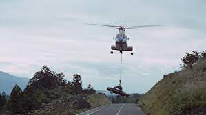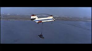 More than just another car chase, Bond is saved from a car full of gunmen, when a helicopter arrives to “pick up” the car with a giant magnet – flying high over Tokyo and dumping them into the water below!