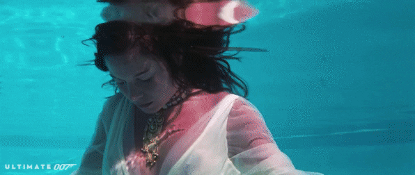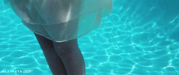 Even though they are 15 stories up, she is tossed out the window and into the hotel pool, wearing only panties and high heels…007 looks down and says “nice aim.”