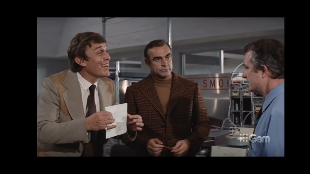 It’s not much of a plot actually: Bond continues to hang out with Tiffany Case as he slowly finds out who is smuggling the diamonds, and we meet two bodyguards for Whyte called Bambi and Thumper who 007 must fight off in order to get Whyte.