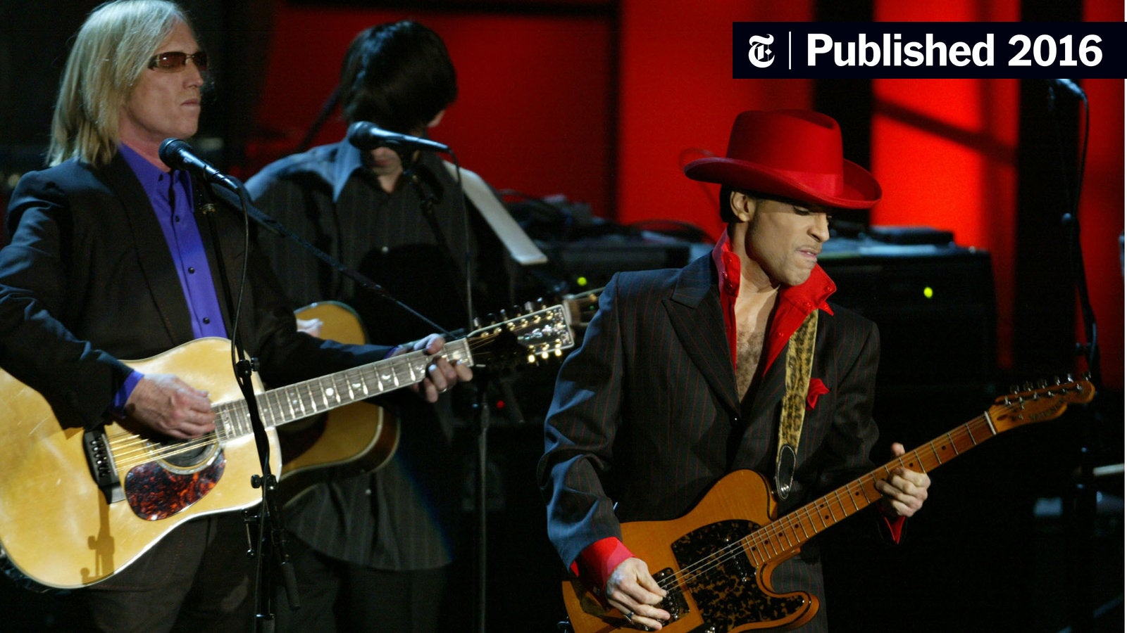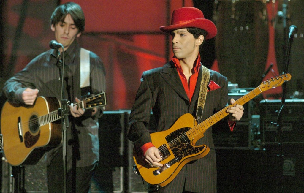 On March 15, 2004, George Harrison was posthumously inducted into the Rock and Roll Hall of Fame. As part of the ceremony, an all-star band performed “While My Guitar Gently Weeps,” Harrison’s best-known Beatles song. The group featured Tom Petty and two other Heartbreakers, as well as Jeff Lynne, Steve Winwood, and Harrison’s son Dhani, who you see here behind Prince.