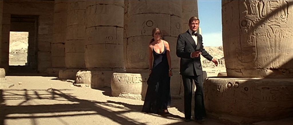 During the Egyptian shoot, the catering didn’t arrive. Producer Albert R. Broccoli jumped into action and took a jeep and some crew, went into town and got some tomatoes, pots, pans and pasta was flown in from Cairo. Broccoli, well known as an amateur chef at home, cooked up a feast for the cast and crew, served by him and Roger Moore. A sign was painted in the mess-room: “Trattoria Broccoli.”