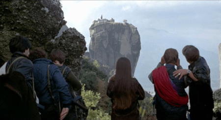 This is Meteora Mountain – and that is a monastery at the top, rented by the Producers for a great climax…but there was a problem: the Monks who lived there didn’t want them! To protest, they placed sheets and plastic on top of the roofs and external walls to make it difficult to film!
