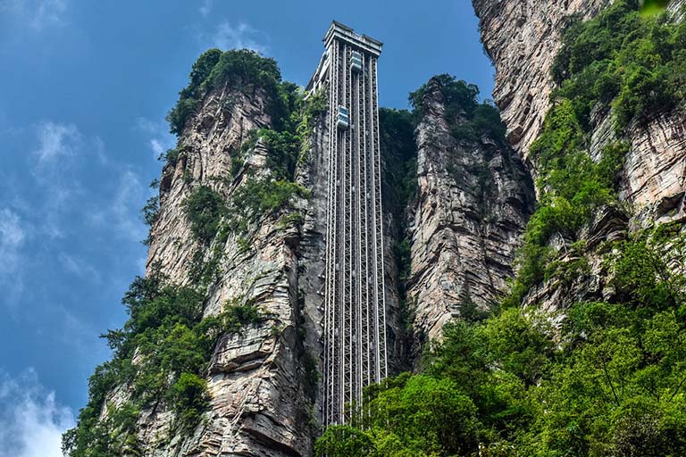 Bailong Elevator, also known as the Hundred Dragons Elevator, is a glass elevator located in the Wulingyuan area of Zhangjiajie, China. It is considered to be the world’s tallest outdoor elevator, standing at a height of 1,070 feet!