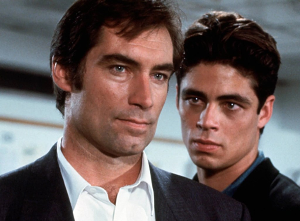 Yes, that’s Benicio del Toro chewing a bit of scenery as the young punk who glowers the entire film…almost as much a Dalton does as Bond…