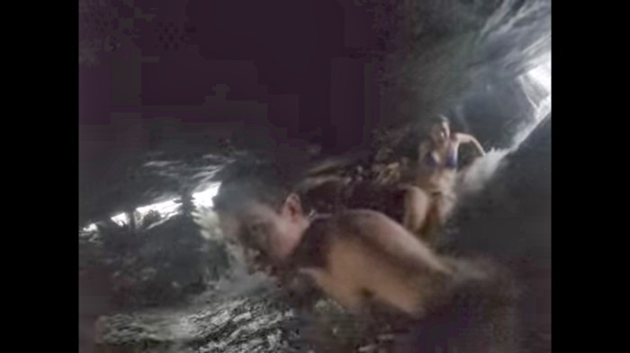 “Daredevils have found that by squeezing your body into the cavity between the group of rocks, the water will send you into a secret cave.