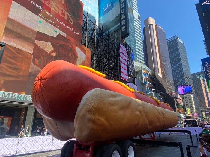 “Introduced to the American masses by central European immigrants as a working-class street food in the 1800s, the hot dog has since become synonymous with contemporary American culture — a staple at baseball games and Fourth of July celebrations, and even employed as a tool of US international relations, referred to as “hot dog diplomacy.” As a symbol and a street cart offering, the hot dog is also a mainstay throughout Times Square and a New York City icon, akin to the yellow taxi cab, the pretzel, the deli cup, and the Playbill.”
