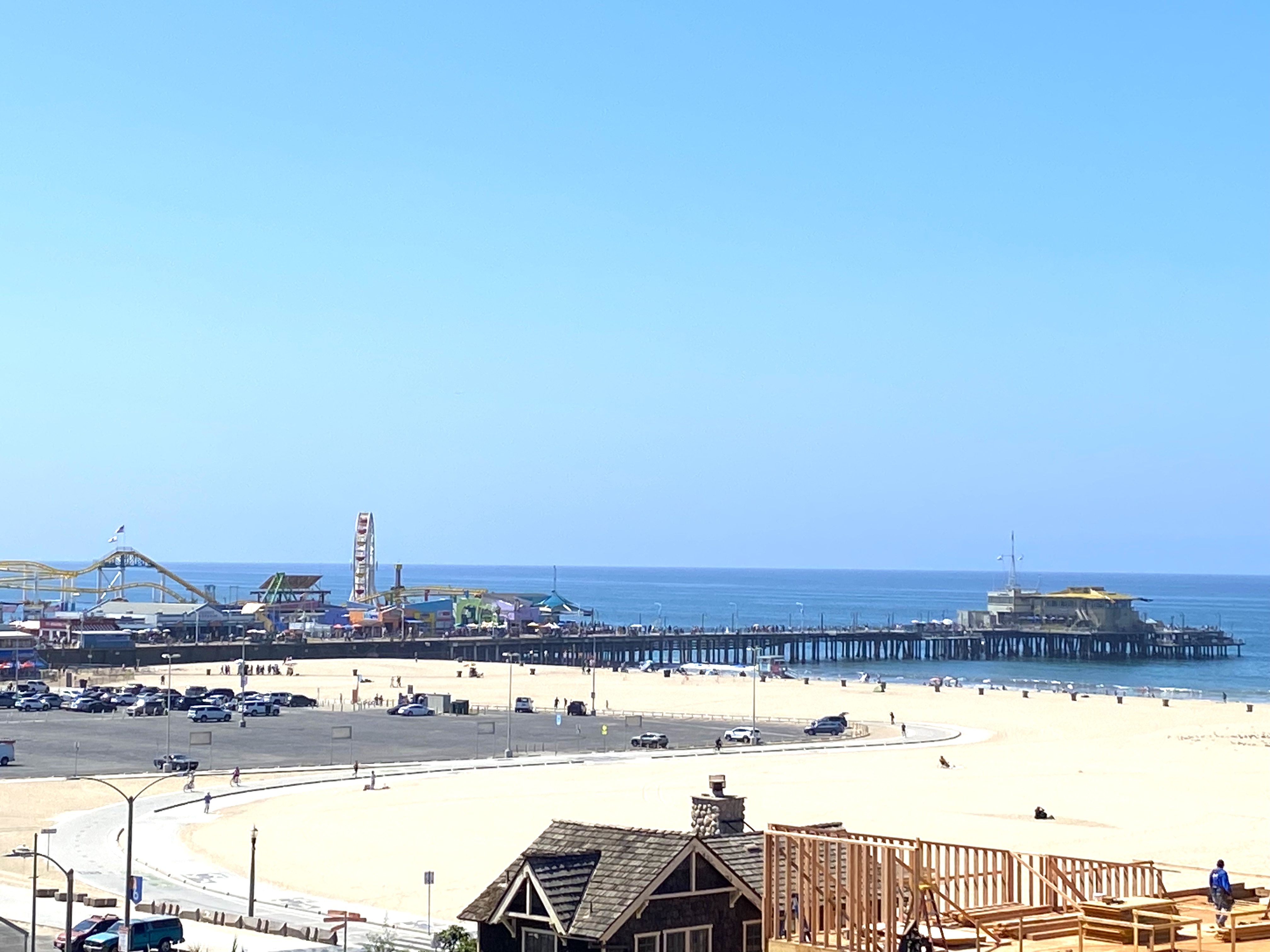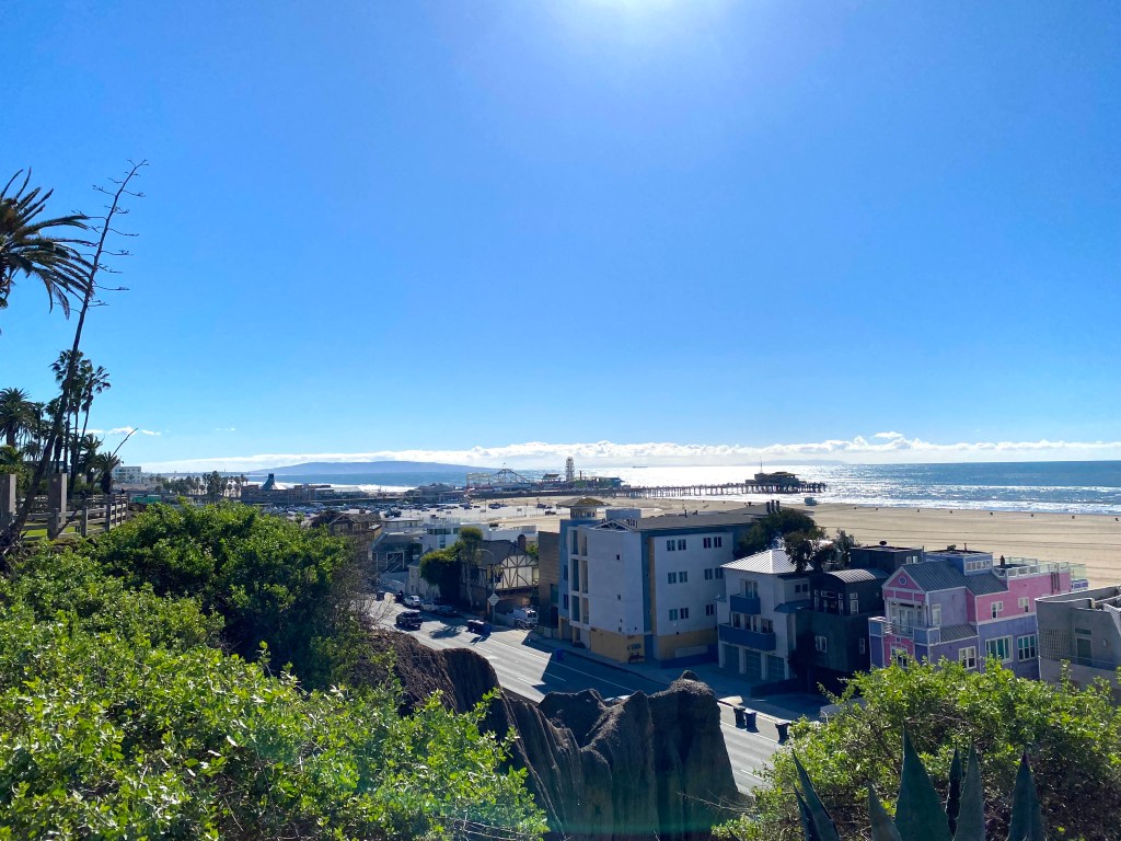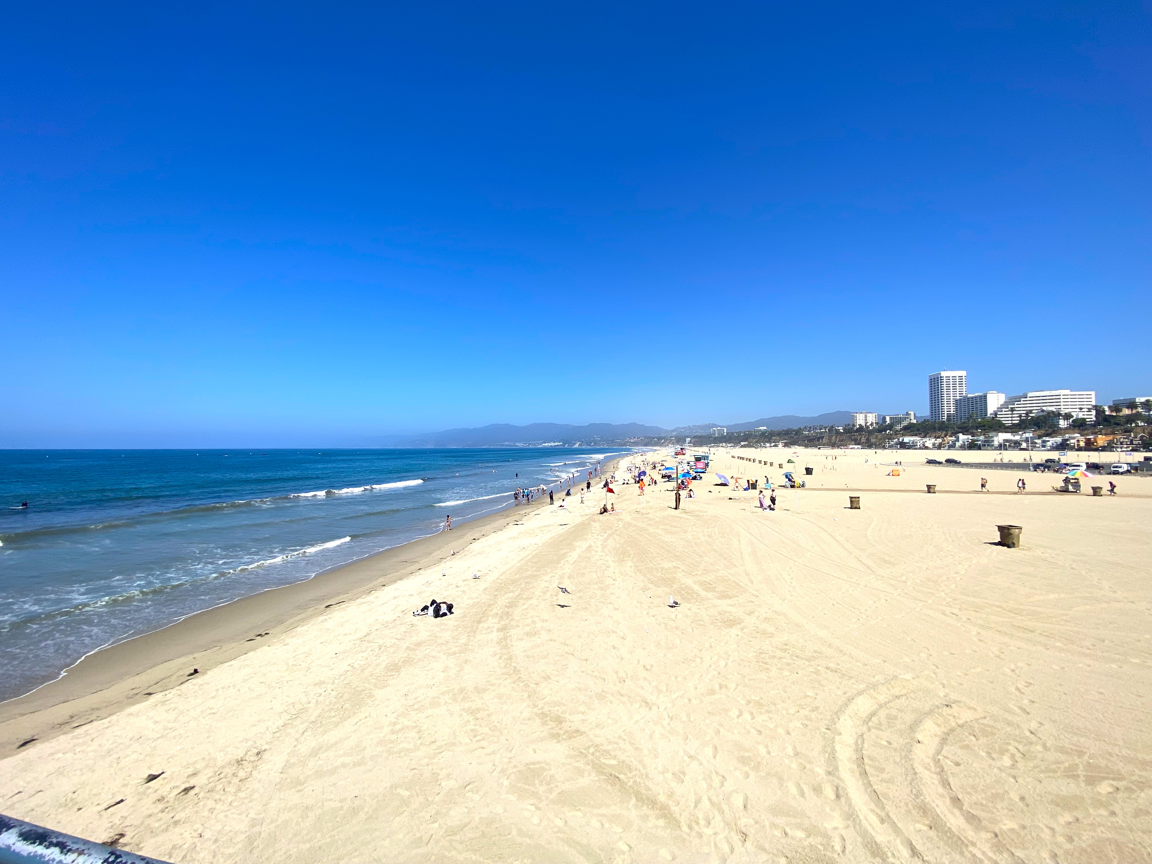 Welcome to Santa Monica, California: the edge of the US! As you can see, beyond the last beach houses sits the Santa Monica Pier, and beyond is nothing but bright blue Pacific Ocean!