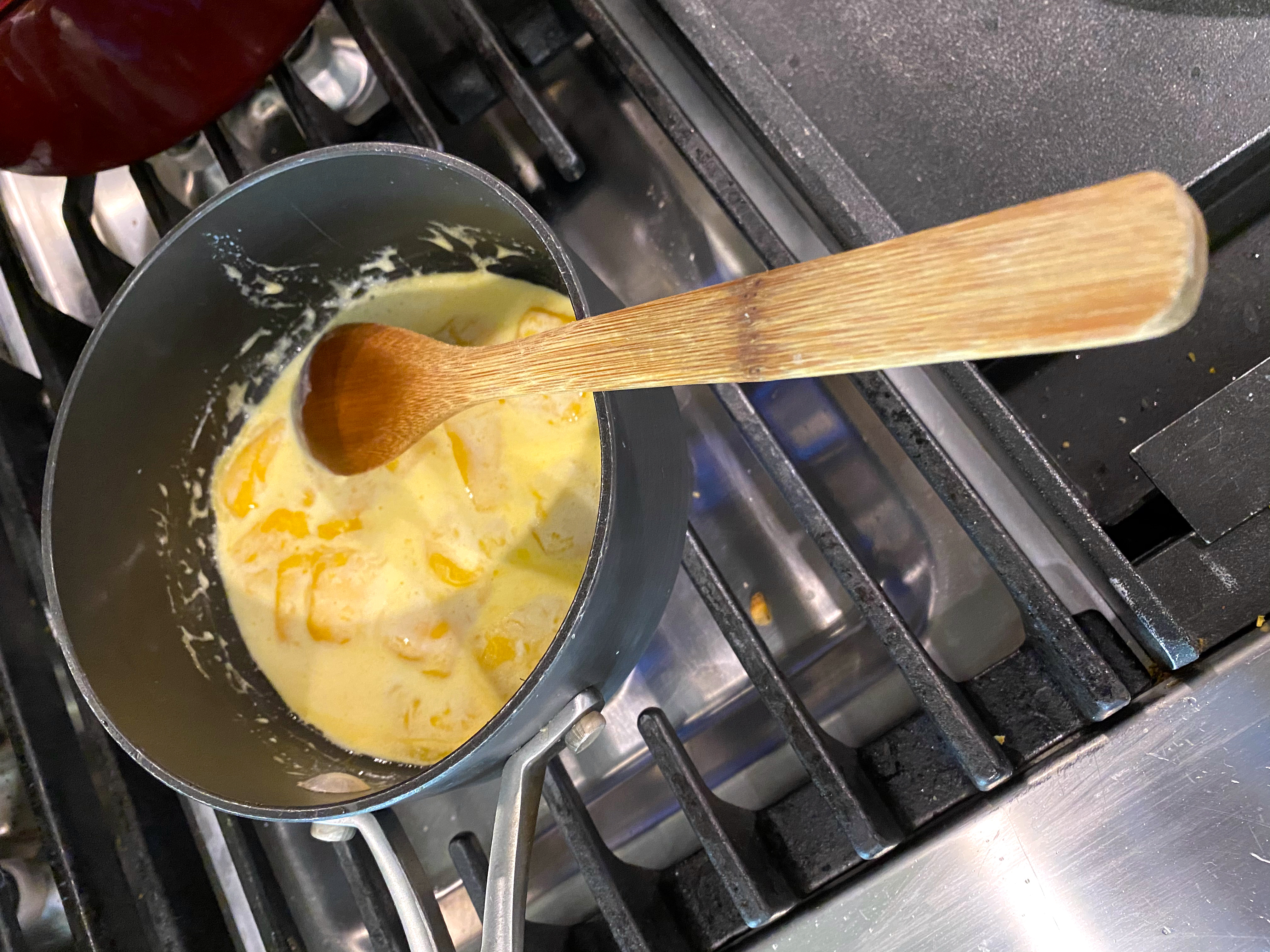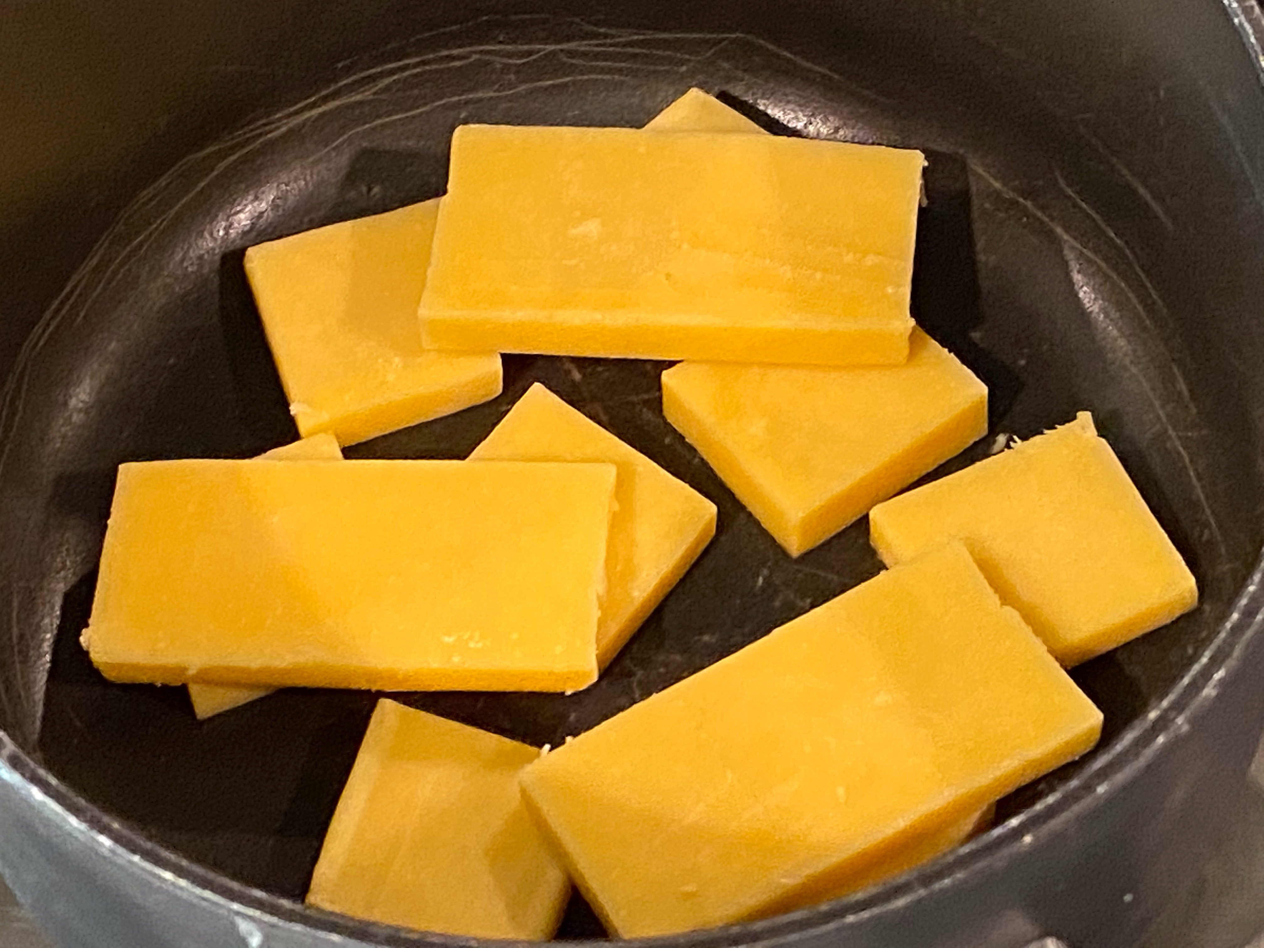 While it was cooking, I sliced a block of Tillamook Extra Sharp Cheddar Cheese, which is a personal favorite – I put it in a pan to heat and slowly melt: