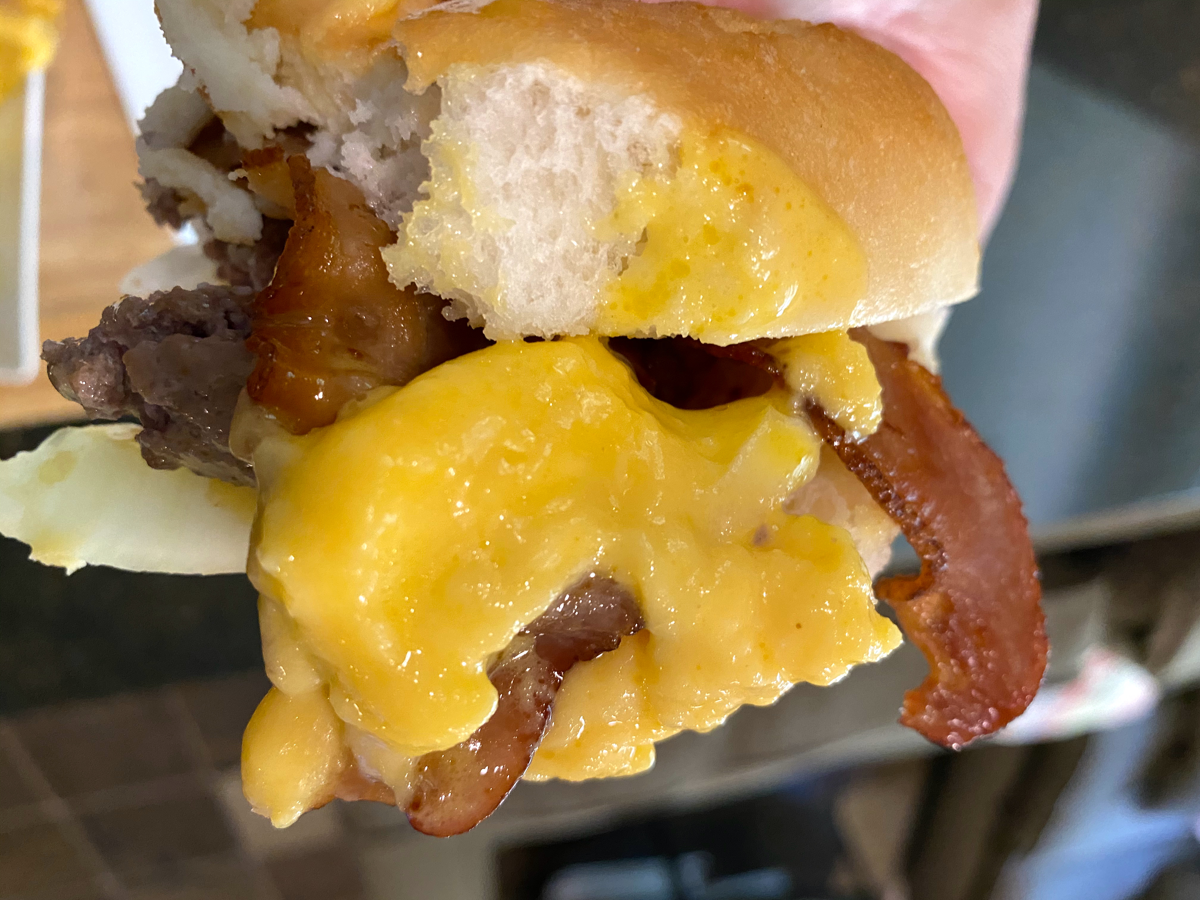The “Burger Dip” is a move you have to make quick, because as the cheese cools it’s more difficult to get it to coat the burger…I think a bit runnier would have been even better.